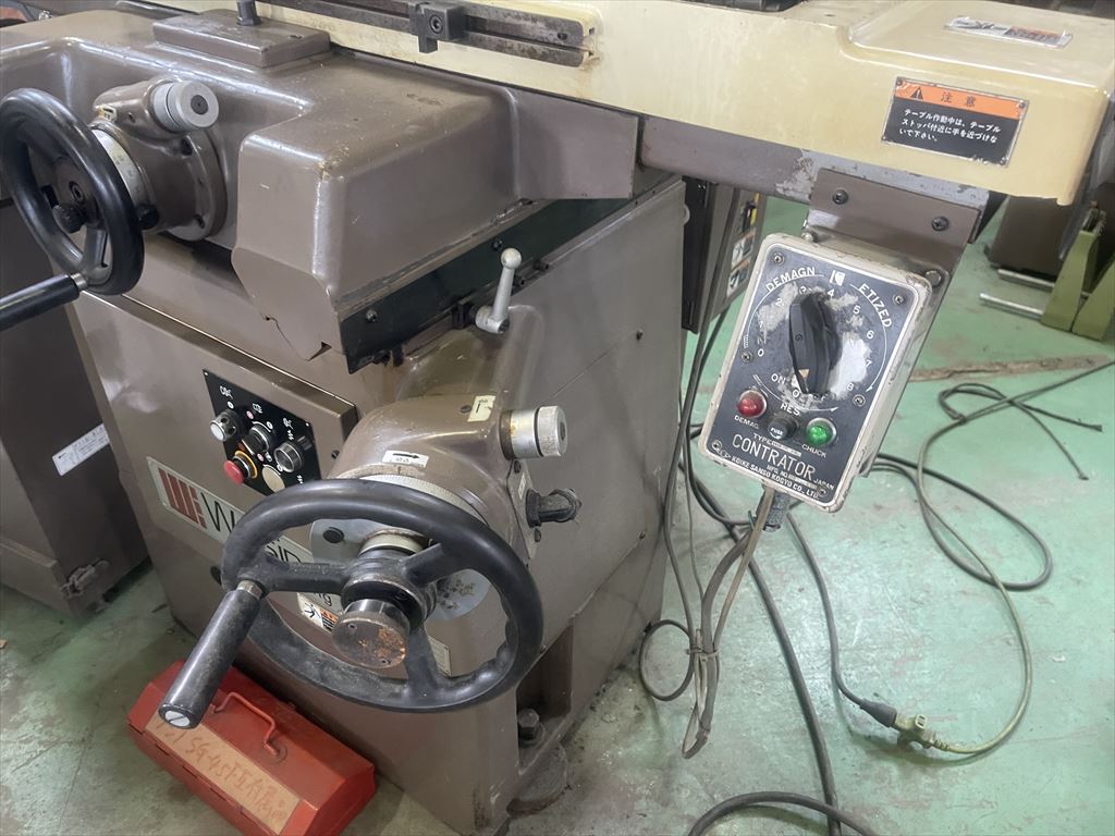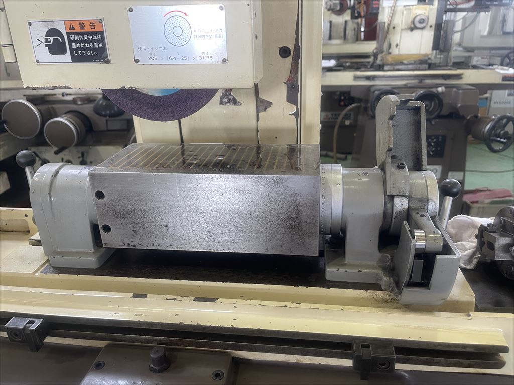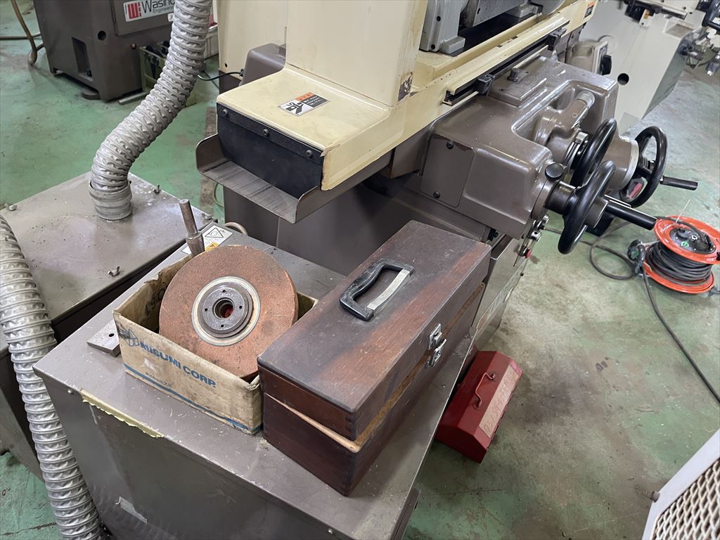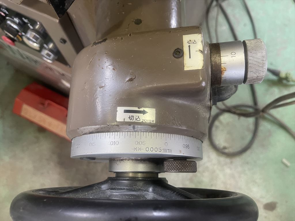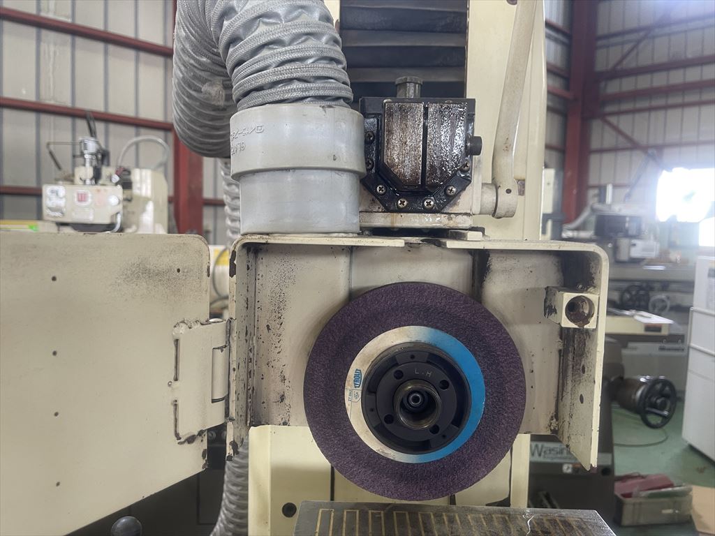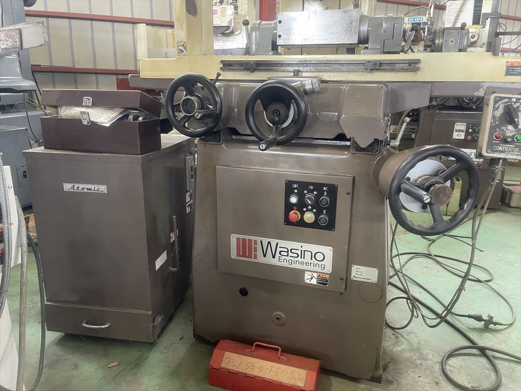 〇特徴  全手動式(上下は早送り付) 上下・前後微細送り装置  テーブル左右動きにワシノ独自の「ローラーウェイ方式」  ハンドル初動圧が極めて小さい軽快で安定したテーブル操作が可能 〇チャック  傾斜チャック(サインバー式):幅270×奥行125×高さ135mm 〇テーブル  作業面積450×150 T溝(幅)17×1本 〇移動量  左右:テーブル左右最大移動量480mm 前後:サドル前後最大移動量180mm  上下:テーブル上面から標準砥石面までの距離447mm 〇ハンドル送り量  左右:ハンドル送り1回転100mm  前後:ハンドル送り(1目盛/1回転):0.02/4 前後微動送り量0.001mm  上下ハンドル送り(1目盛り/1回転):0.005/1  上下:ハンドル送り微動送り量0.001mm  ※上下早送り機能付き(速度500mm/min) 〇砥石  寸法:外径φ205mm×幅6.4-25mm×φ31.75mm 回転数:2850rpm 〇モータ  砥石軸用:0.75kw-2P 上下早送り用:0.1kw-6P 〇機械寸法・重量  幅1820mm×奥行1278mm×高さ1775mm 機械質量1000㎏ 〇付属品  集塵機付
