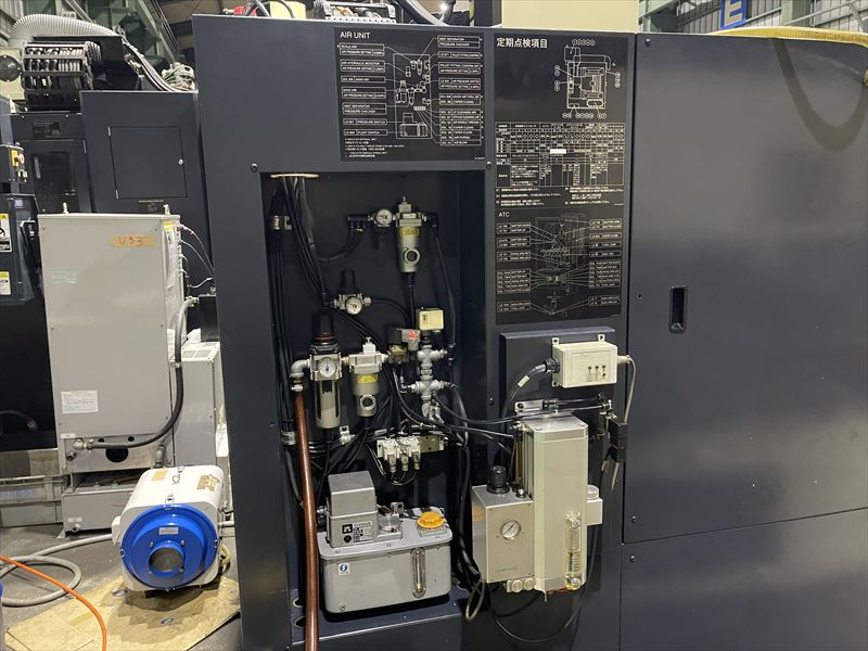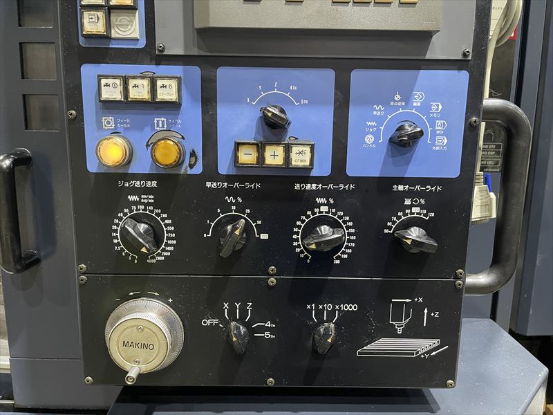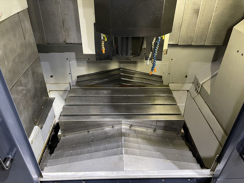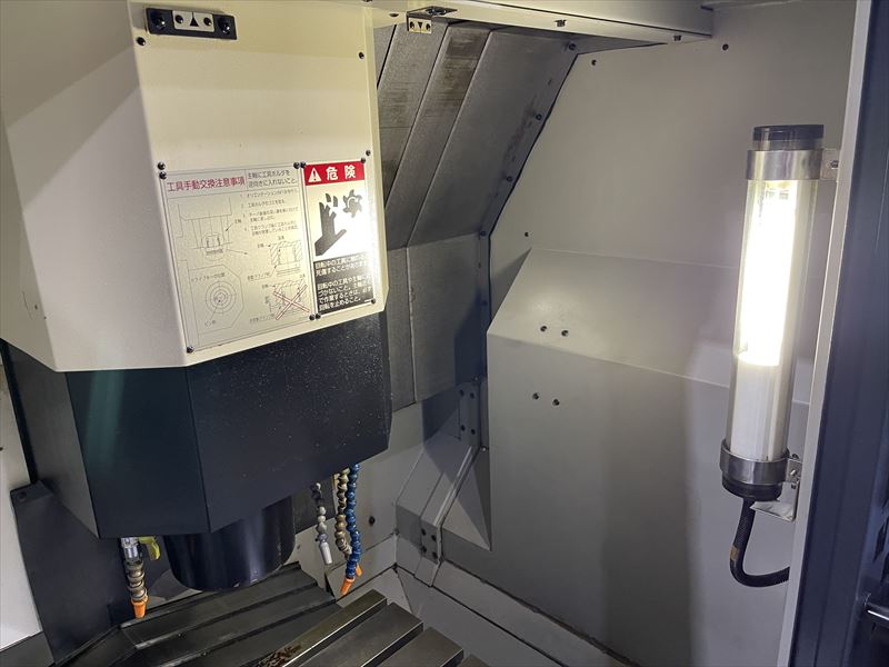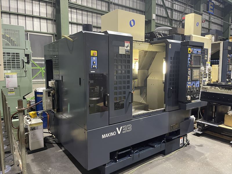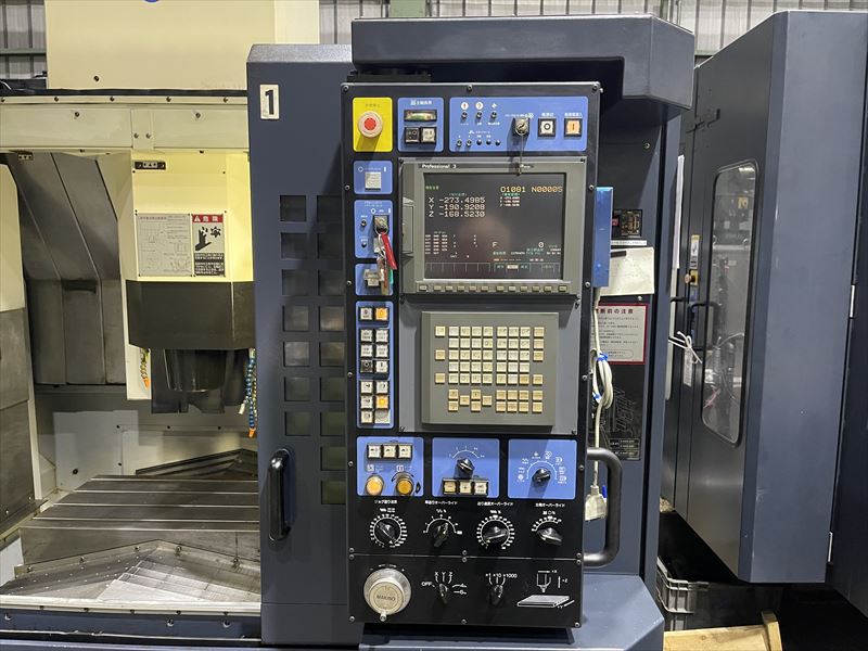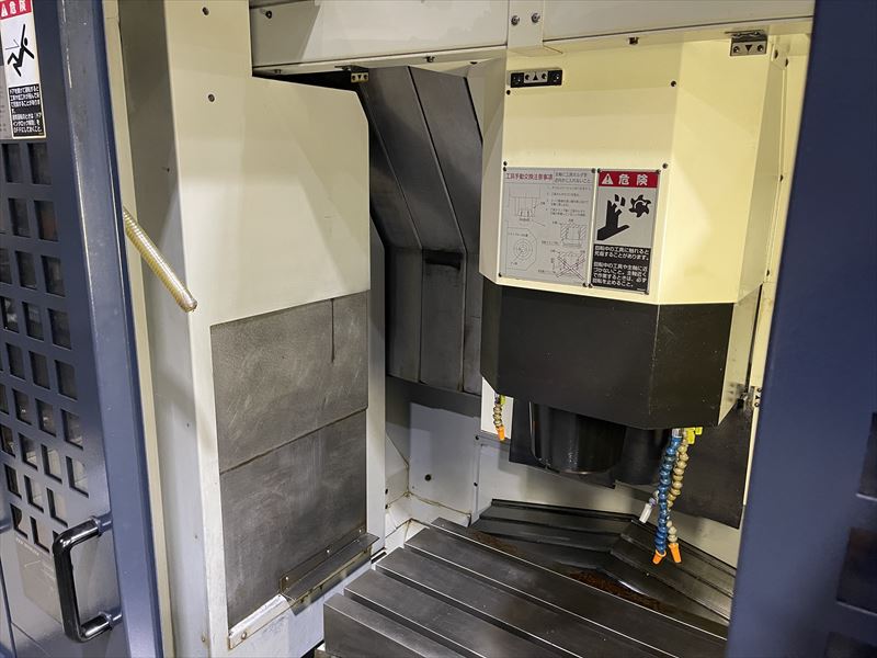 〇NC装置  MAKINO-Professiona3 〇テーブル  作業面積:750×400mm(T溝18H8×4本)  最大積載質量:300 kg 〇主軸  ホルダシャンク:HSK-A63  最高主軸回転速度:20,000rpm 〇ATC  格納本数 15本 〇各軸移動量  X軸(主軸頭左右)600mm×Y軸(テーブル前後)400mm×Z軸(主軸頭上下)350mm    主軸端面~テーブル上面まで:150~500 mm 〇送り速度   早送速度:XYZ軸20000mm/min  切削送り:XYZ軸1~20000mm/min 〇タンク   切削タンク 130 L 〇所要動力源   総電源容量:33KVA  エアー圧源:0.5~0.8MPa 600NL/min  〇機械の大きさ   寸法:幅2280×奥2040×高2400mm  重量:7300Kg