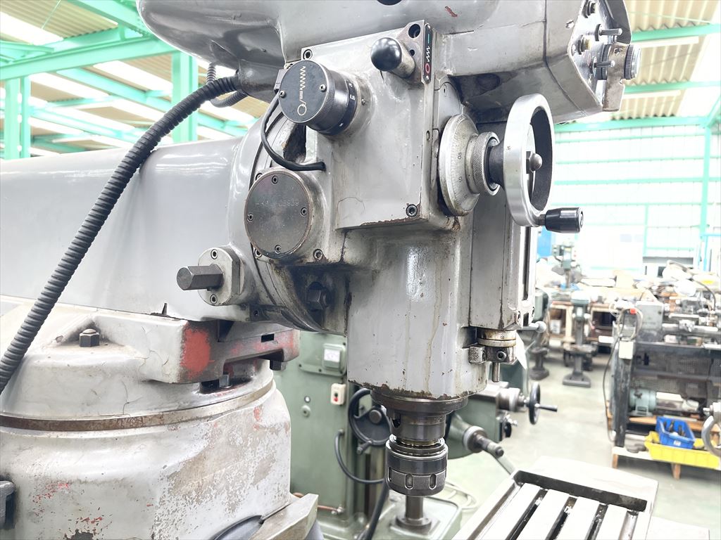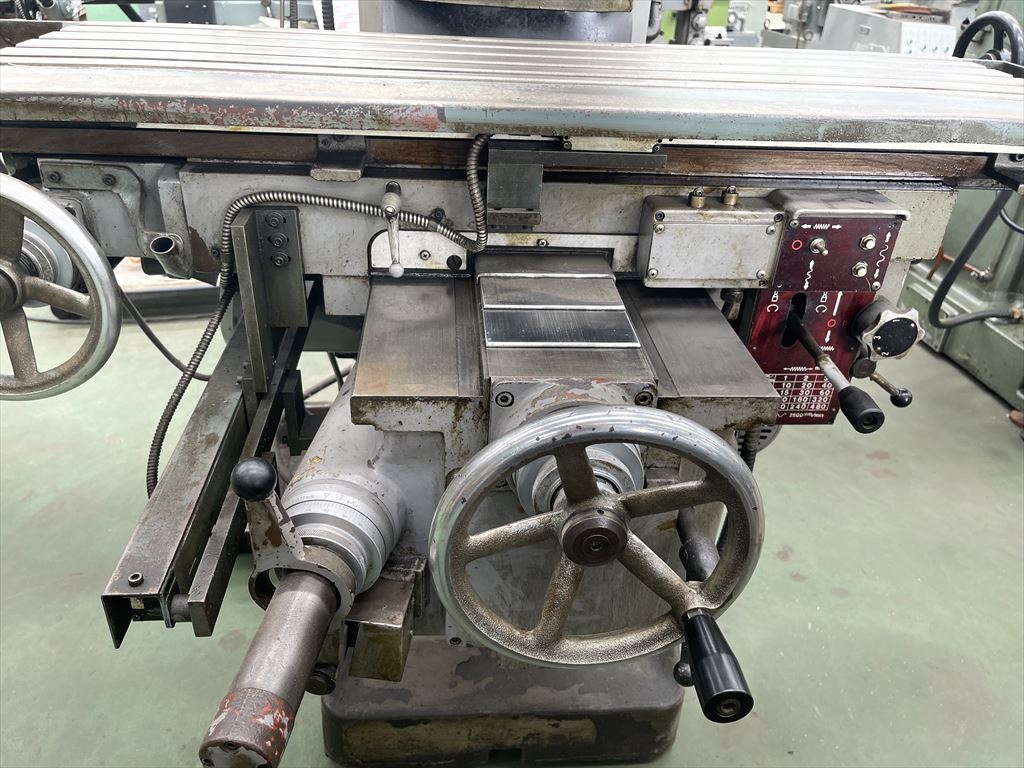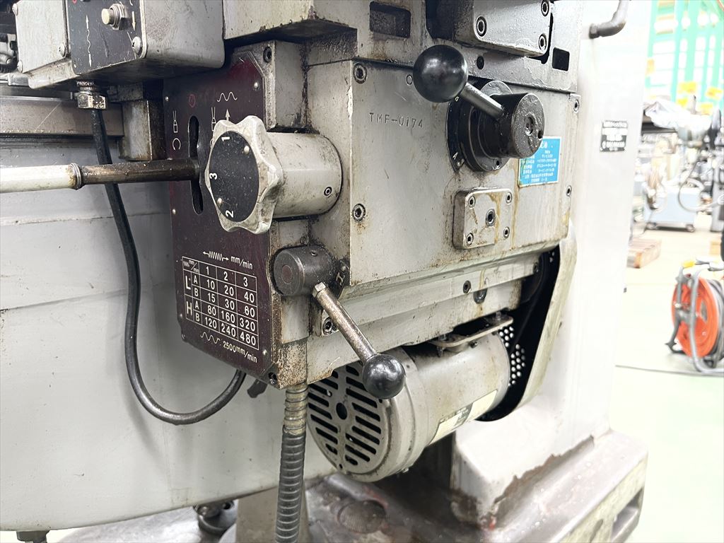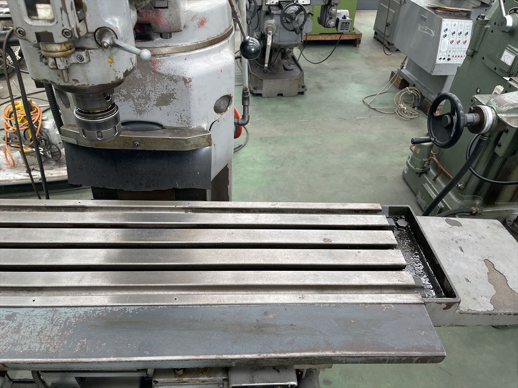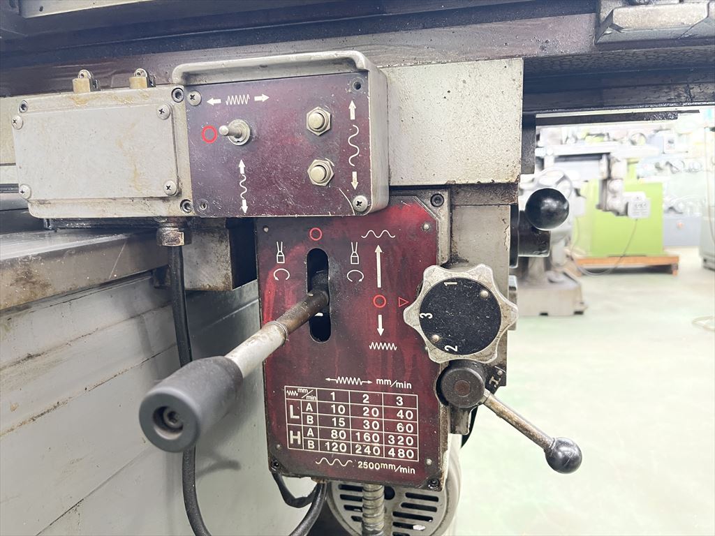 ○テーブル作業面積  1100×270(T溝の幅16mm×3本) ○テーブルの移動量  (左右)700×(前後)400×(上下)400 ○ラム前後動き  400 ○オーバーラム旋回  (左右)180° ○主軸端とテーブル上面までの距離  90~490 ○テーブル左右送り速度  切削10~480mm/min(12段変速) 早送り速度2500mm/min ○テーブル上下早送り速度  830mm/min ○主軸  端形状JIS №40 回転数75~4000rpm(12段変速) クイル上下ストローク120  自動送り0.025-0.05-0.1mm/rev ○主軸頭左右傾斜角度  (各)45° ○モータ  主軸用1.5kw4P テーブル左右自動送り用0.4kw4P  上下早送り用0.75kw4P 切削油ポンプ用50W ○機械の大きさ  寸法:幅1710×奥行2160×高さ2100 機械重量1610Kg