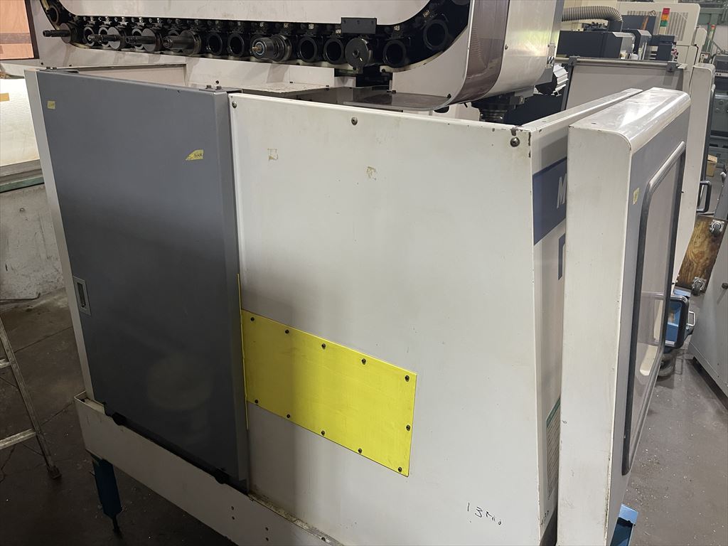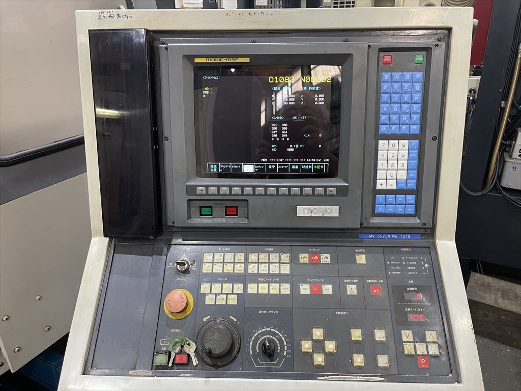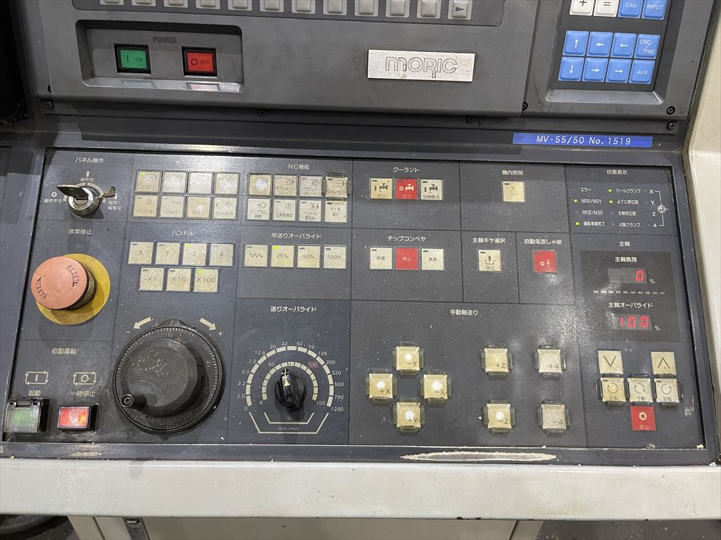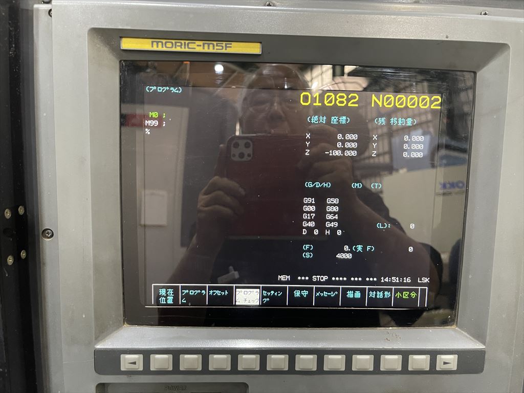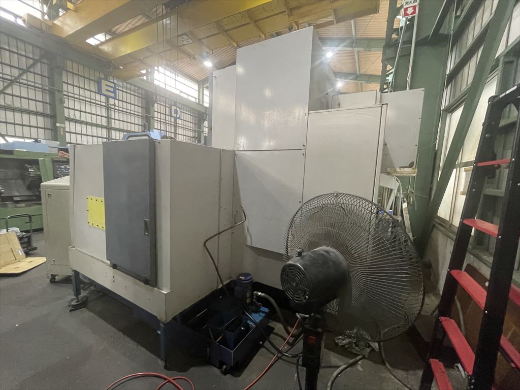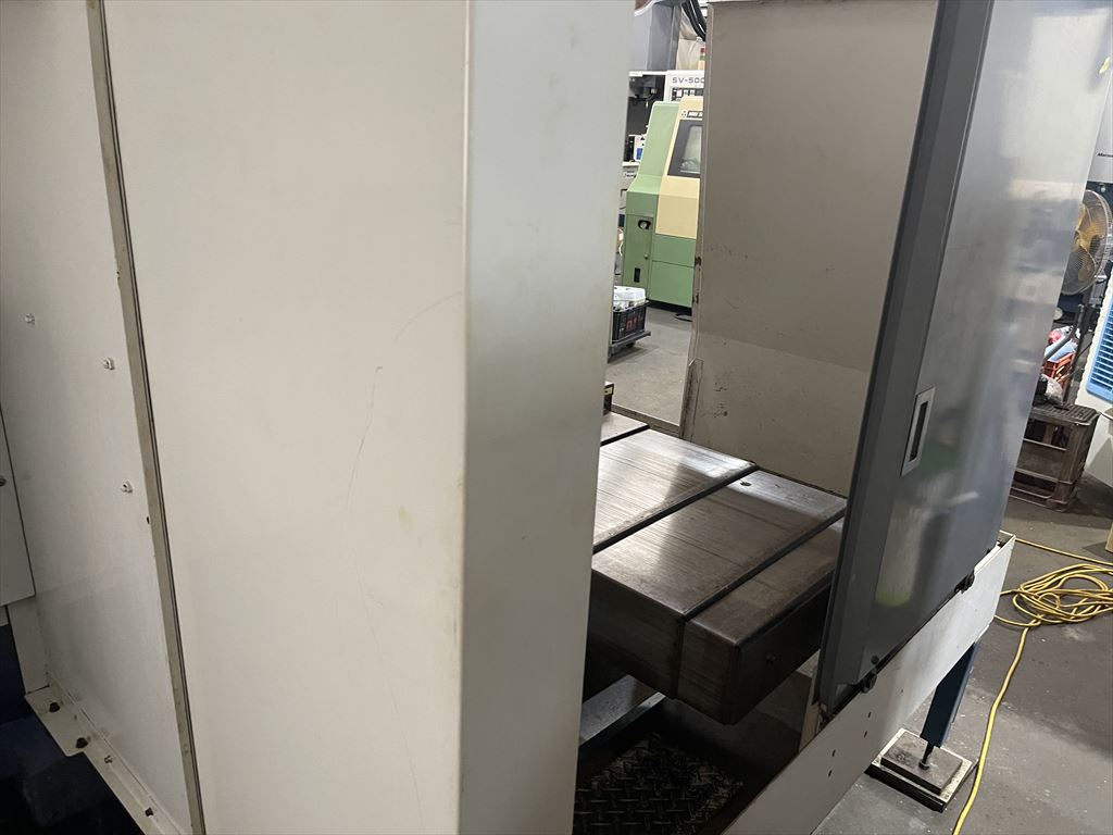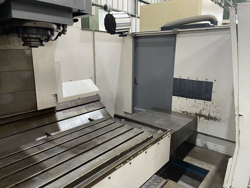 ○NC装置  MORIC M5F(FANUC15MF 対話) ○移動量  X軸(テーブル左右):1050 Y軸(サドル前後):550 Z軸(主軸頭上下):560  テーブル上面から主軸端面までの距離:200~760  コラム前面から主軸中心までの距離:600 ○テーブル  作業面:1400×550(T溝18mm×5本×100mmピッチ)  最大積載質量:1500㎏ ○主軸  回転速度:4000rpm(無段)  テーパ穴と主軸軸受内径:№50/φ100 ○送り速度  早送り速度:(X・Y)15000 (Z)12000mm/min  切削送り速度:0.001~5000mm/min  ジョグ送り速度:0~2000mm/min(20段) ○ATC  40本 ○モータ  主軸用(30分/連続):AC11/7.5kw  送り軸用:X・Y軸用AC1.8kw Z軸用AC2.8kw ○電源・空気圧減  32KVA 0.5MPa 100L/min ○機械の大きさ  幅3400×奥行3615×高さ2990(※搬入時は2667) 機械質量10000㎏ ○その他  操作盤別置タイプ