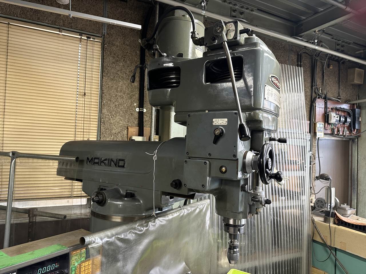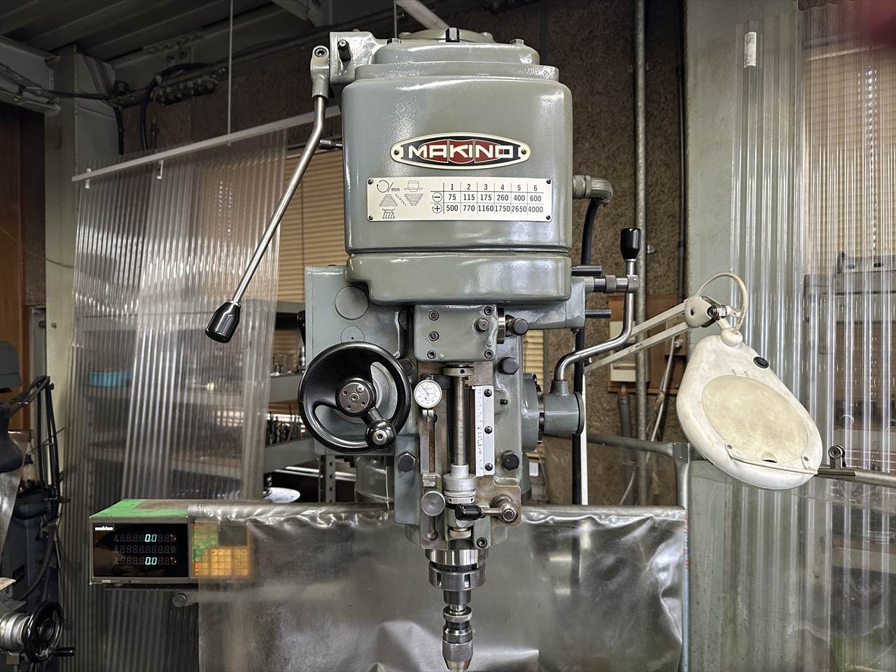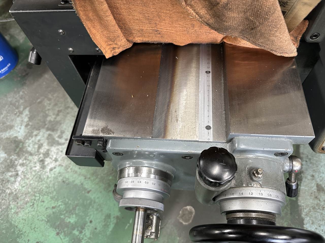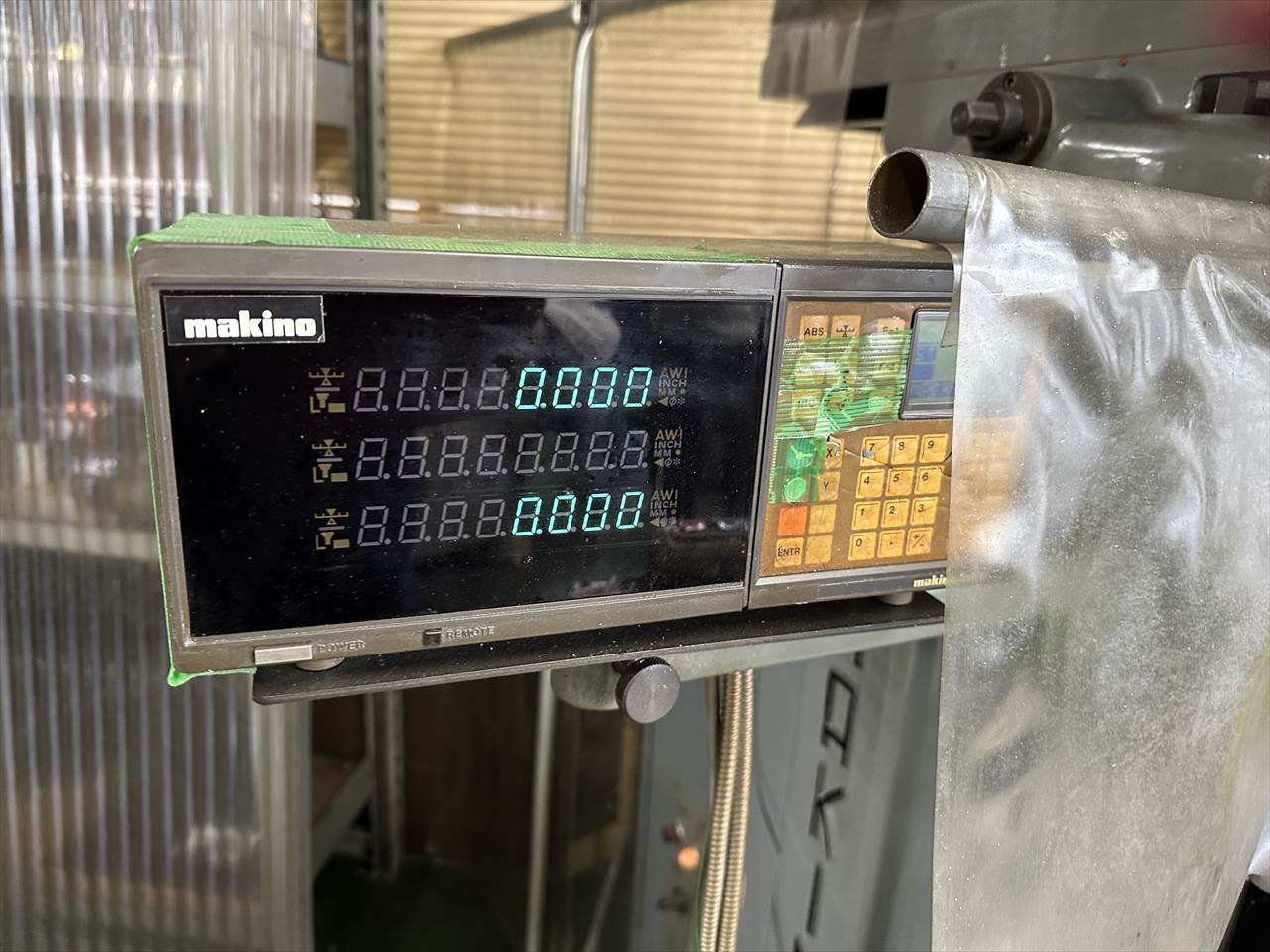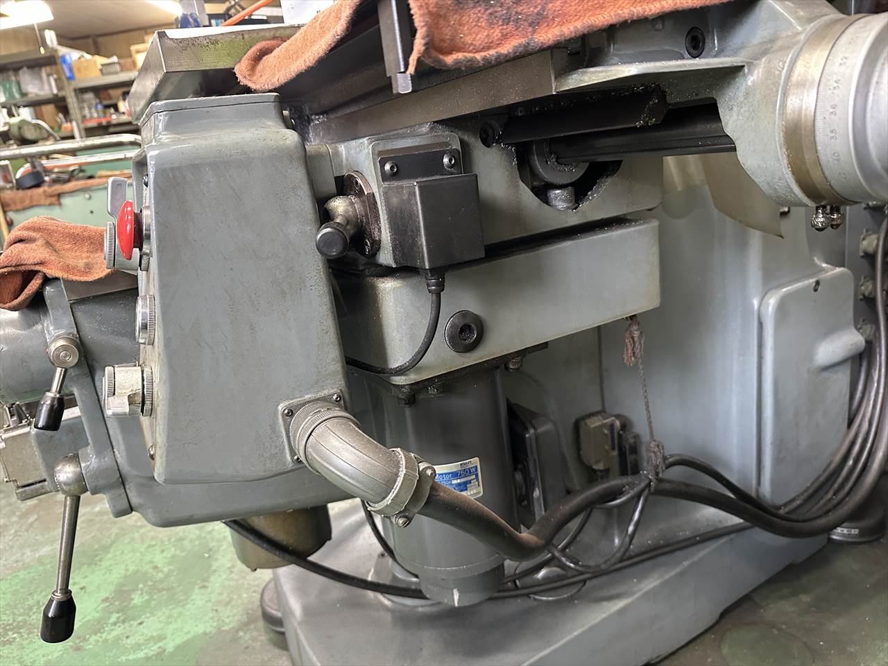 ○特徴  XY2軸デジタル付 100mmレージングブロック付(かさ上げ)  主軸クイル100mm上下自動送り  テーブル左右自動送り(インバータ無段変速)・早送り  テーブル上下早送り テーブル前後は手動送り   バイスとミーリングチャック付 ○テーブル  作業面積 1100mm×250mm (T溝幅14mm×3本) ○主軸  主軸穴のテーパ:№40 主軸回転数:75~4000rpm(ベルト掛け替え12段)  主軸頭旋回角度:左右±45° ○ストローク  テーブル:左右550×前後250mm×上下350mm 主軸クイル送り量:100mm  オーバーアーム前後動き:300mm ○干渉距離  主軸端面からテーブル上面までの距離:105~555mm  (100mmレージングブロック)  主軸中心からコラム前面までの距離:125~425mm ○送り速度  テーブル左右自動送り速度:22~832mm/min(インバータ無段変速)  テーブル左右早送り速度:2900mm/min  ニー上下早送り速度:1430mm/min クイル自動送り:0.04-0.08-0.16mm/rev ○モータ  主軸用:1.5kw 送り駆動用:0.45kw 所要電力:3.9KVA ○機械寸法・重量  幅2190mm×奥行1815mm×高さ2180mm(100mmレージングブロック)  機械重量1550Kg