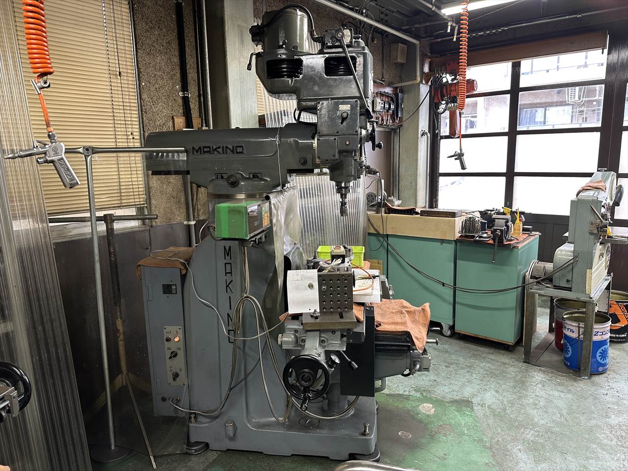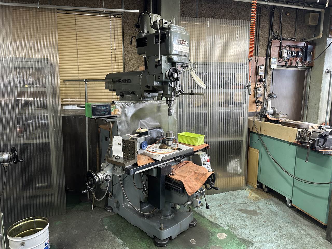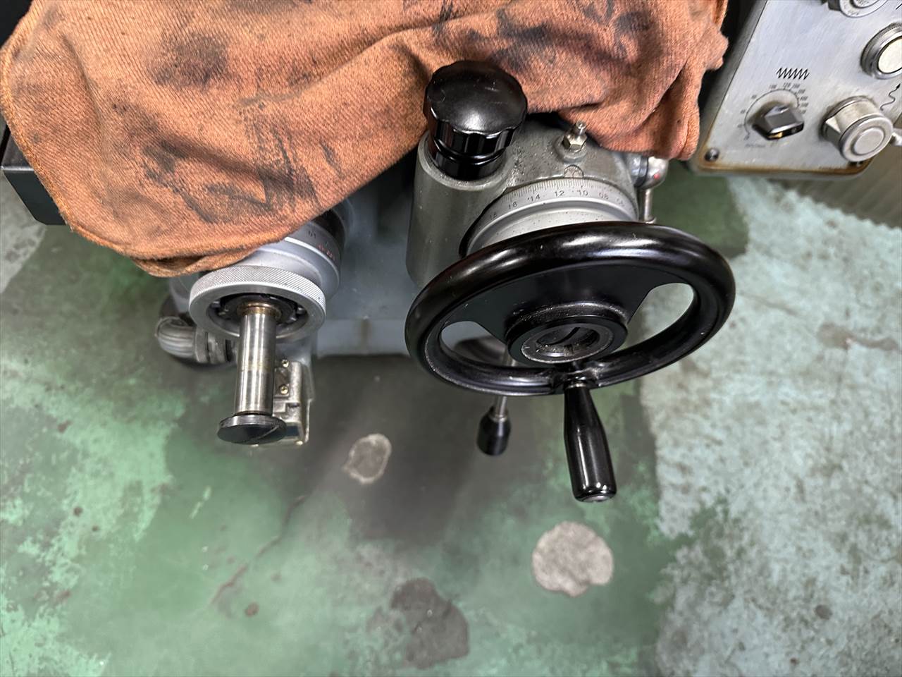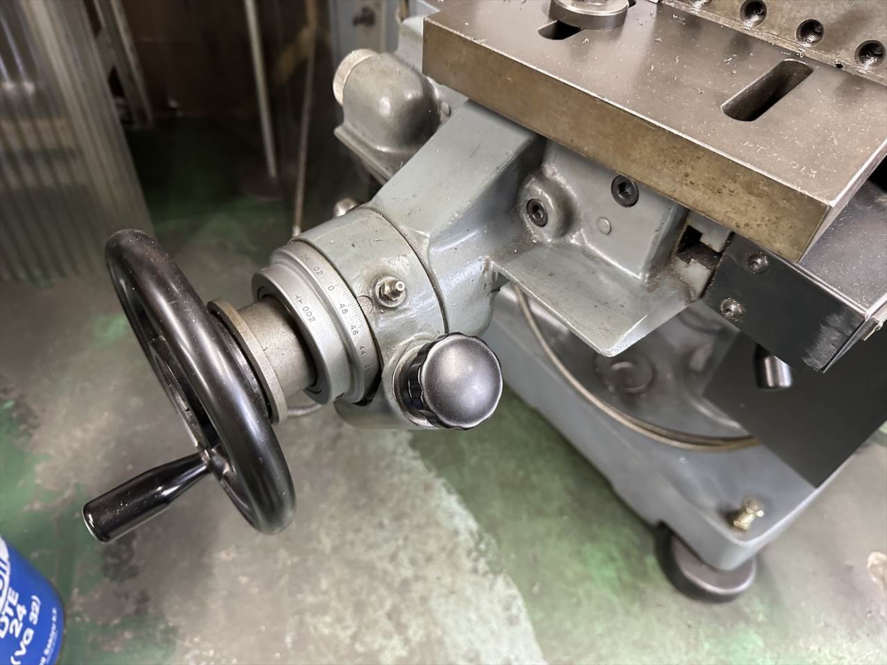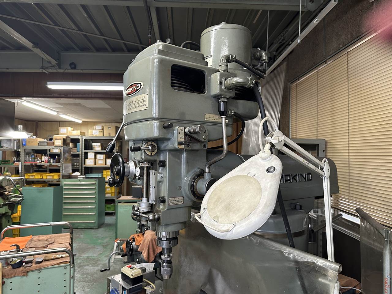 ○特徴  XY2軸デジタル付 100mmレージングブロック付(かさ上げ)  主軸クイル100mm上下自動送り  テーブル左右自動送り(インバータ無段変速)・早送り  テーブル上下早送り テーブル前後は手動送り   バイスとミーリングチャック付 ○テーブル  作業面積 1100mm×250mm (T溝幅14mm×3本) ○主軸  主軸穴のテーパ:№40 主軸回転数:75~4000rpm(ベルト掛け替え12段)  主軸頭旋回角度:左右±45° ○ストローク  テーブル:左右550×前後250mm×上下350mm 主軸クイル送り量:100mm  オーバーアーム前後動き:300mm ○干渉距離  主軸端面からテーブル上面までの距離:105~555mm  (100mmレージングブロック)  主軸中心からコラム前面までの距離:125~425mm ○送り速度  テーブル左右自動送り速度:22~832mm/min(インバータ無段変速)  テーブル左右早送り速度:2900mm/min  ニー上下早送り速度:1430mm/min クイル自動送り:0.04-0.08-0.16mm/rev ○モータ  主軸用:1.5kw 送り駆動用:0.45kw 所要電力:3.9KVA ○機械寸法・重量  幅2190mm×奥行1815mm×高さ2180mm(100mmレージングブロック)  機械重量1550Kg