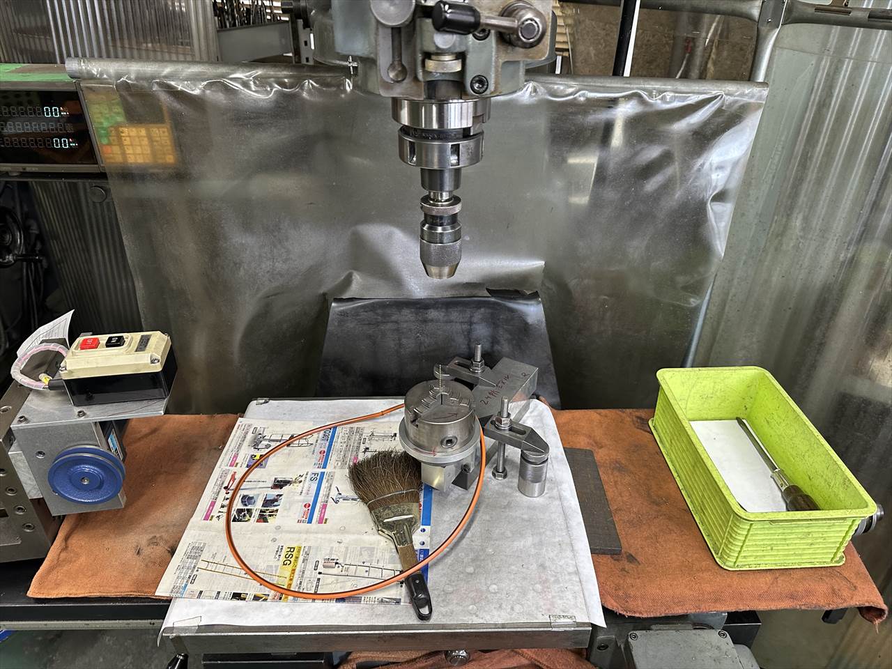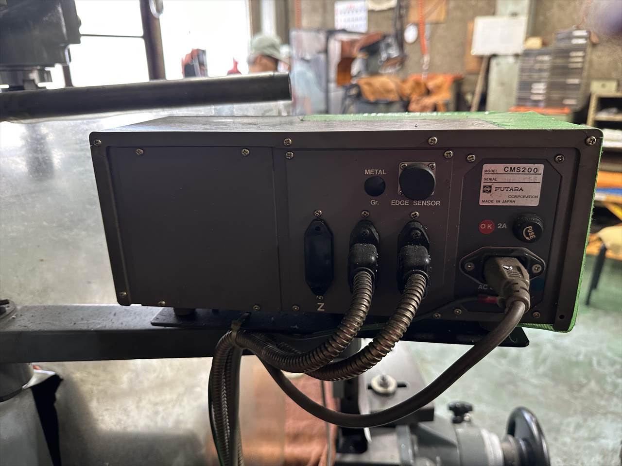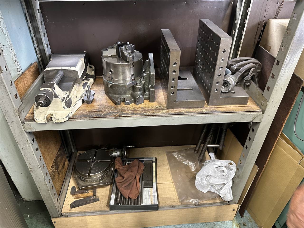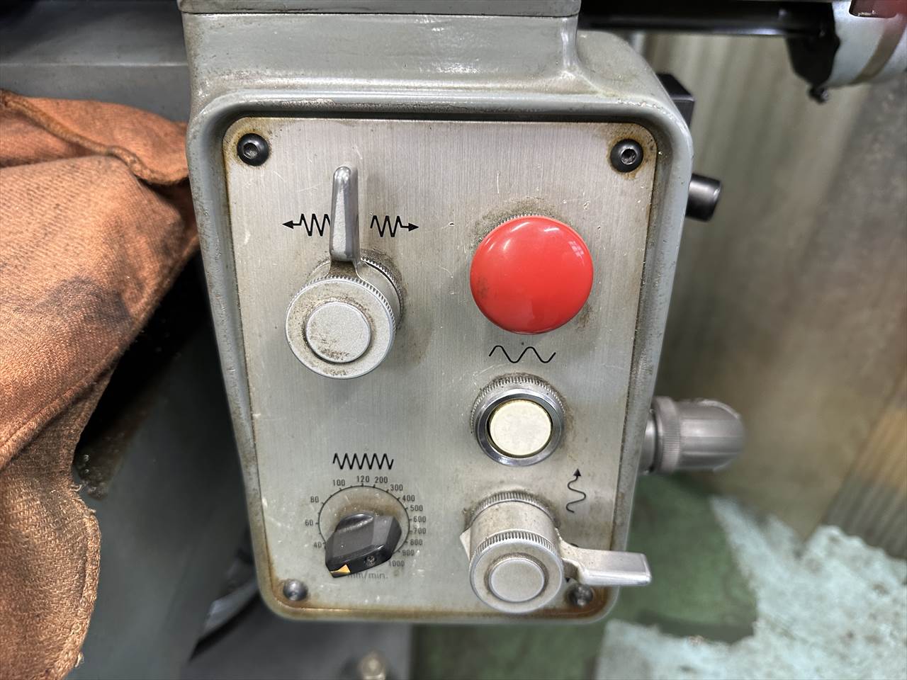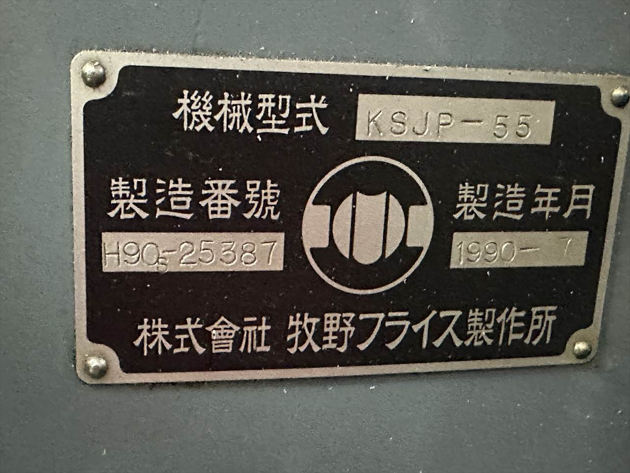 ○特徴  XY2軸デジタル付 100mmレージングブロック付(かさ上げ)  主軸クイル100mm上下自動送り  テーブル左右自動送り(インバータ無段変速)・早送り  テーブル上下早送り テーブル前後は手動送り   バイスとミーリングチャック付 ○テーブル  作業面積 1100mm×250mm (T溝幅14mm×3本) ○主軸  主軸穴のテーパ:№40 主軸回転数:75~4000rpm(ベルト掛け替え12段)  主軸頭旋回角度:左右±45° ○ストローク  テーブル:左右550×前後250mm×上下350mm 主軸クイル送り量:100mm  オーバーアーム前後動き:300mm ○干渉距離  主軸端面からテーブル上面までの距離:105~555mm  (100mmレージングブロック)  主軸中心からコラム前面までの距離:125~425mm ○送り速度  テーブル左右自動送り速度:22~832mm/min(インバータ無段変速)  テーブル左右早送り速度:2900mm/min  ニー上下早送り速度:1430mm/min クイル自動送り:0.04-0.08-0.16mm/rev ○モータ  主軸用:1.5kw 送り駆動用:0.45kw 所要電力:3.9KVA ○機械寸法・重量  幅2190mm×奥行1815mm×高さ2180mm(100mmレージングブロック)  機械重量1550Kg
