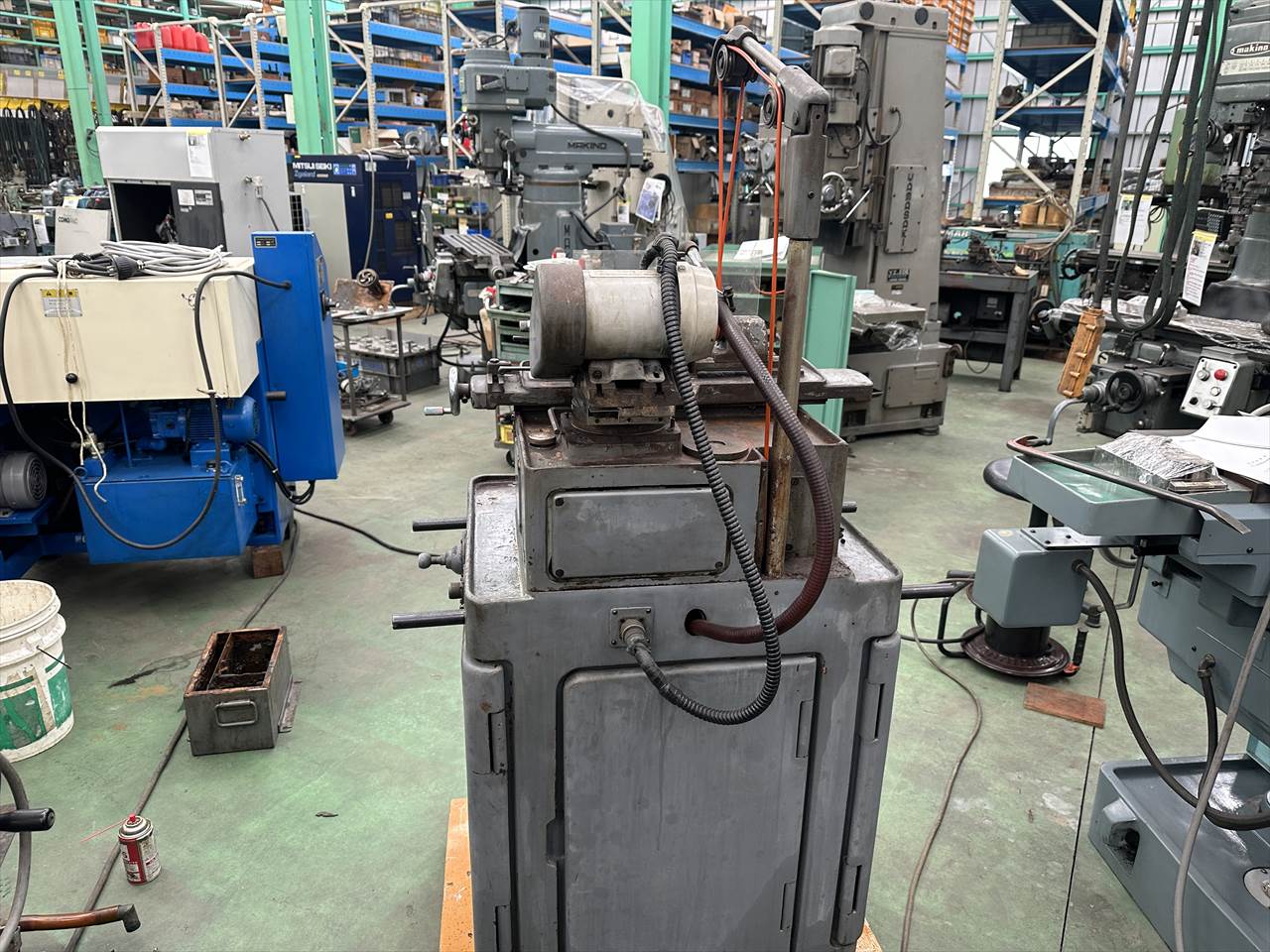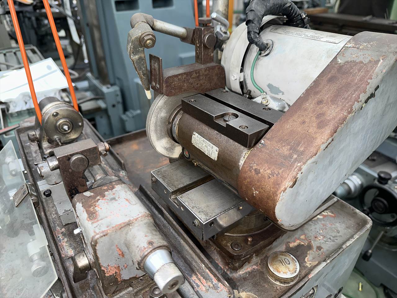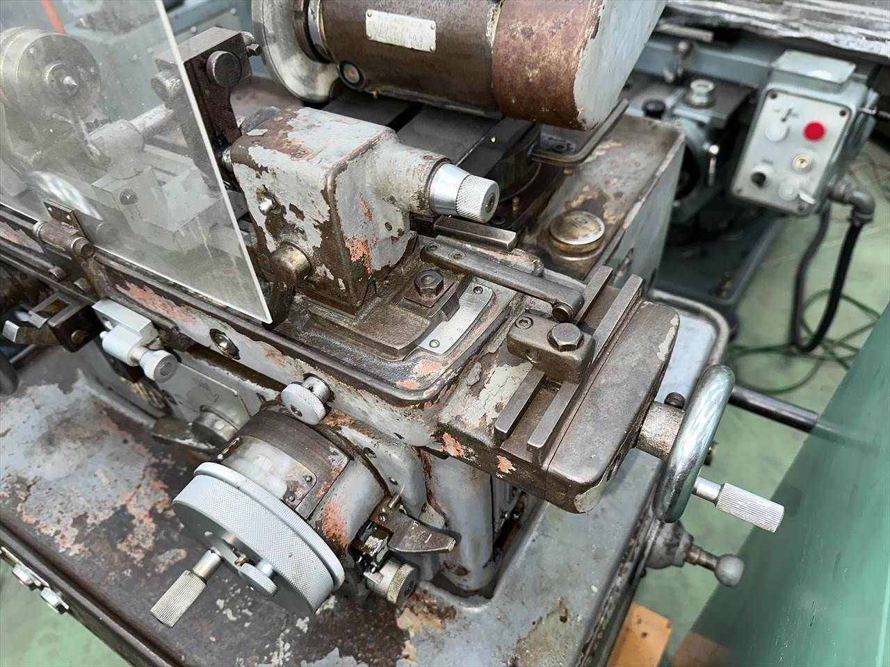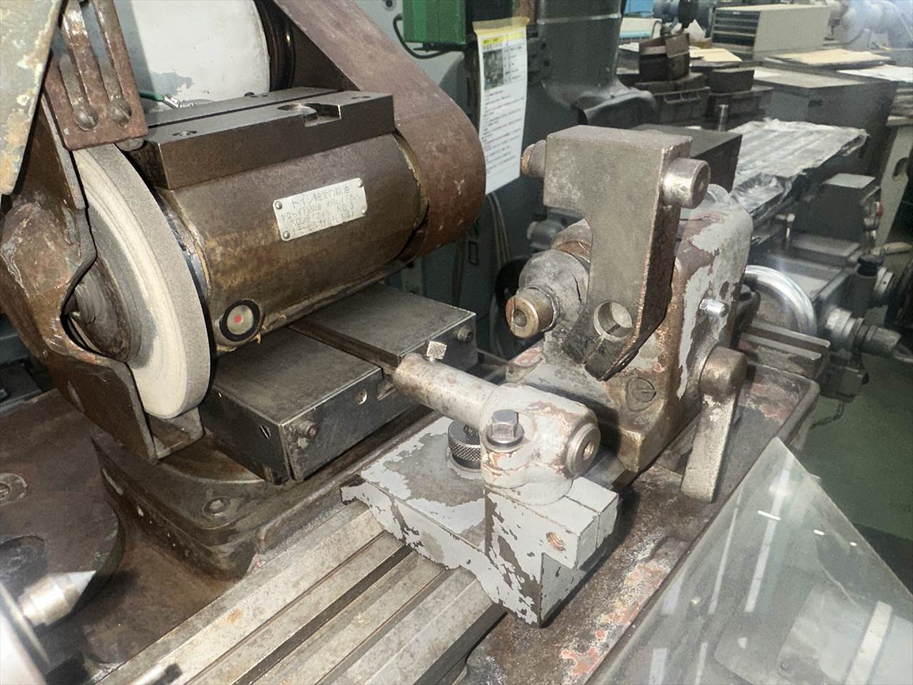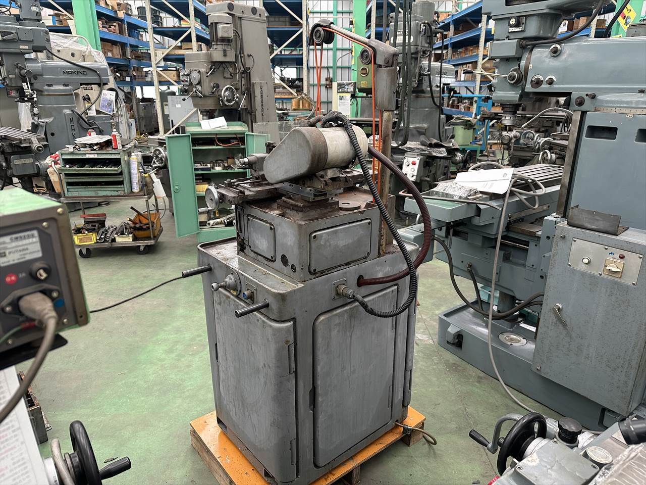 ○特徴  付属品多数(キャビネット付)  特に旋廻主軸台付きのため加工範囲が広い ○研削できる工作物  最大外径:φ35mm 最少外径:φ0.8mm  最大長さ:手動150mm 自動80mm ○機械の能力  センタ間の最大距離:150mm テーブル上の振り:φ105mm  コレットチャックの最大径:φ12mm(オプション旋廻主軸台) ○回転数  外径砥石車(50/60Hz):5000、6000rpm  主軸(5段):190、310、515、850、1400rpm ○砥石車  外径φ125×幅MAX13×内径φ19.5mm ○砥石台  前後方向の移動量:30mm 旋廻できる角度:±90°  ダイヤルの1目盛の読み:0.002mm ○テーブル  旋廻できる角度:±4.5°  左右方向の最大移動量:手動150 自動80mm  送り速度(3段):50~1120mm/min ○モータ  砥石車用:回転数3000/3600rpm(50/60Hz) 出力0.2kw2P  テーブル駆動用:回転数1500/1800rpm(50/60Hz) 出力0.2kw4P ○機械の大きさ  所要床面積:間口830×奥行710×高さ1520mm  床面から主軸中心までの高さ:1100mm 重量480㎏  工具キャビネット:間口500×奥行450×高さ1000mm