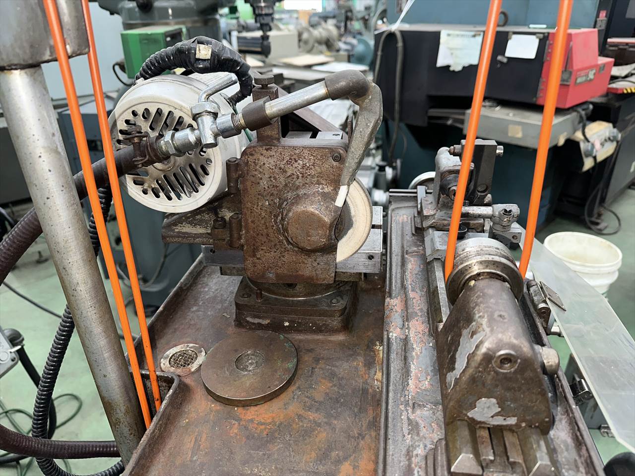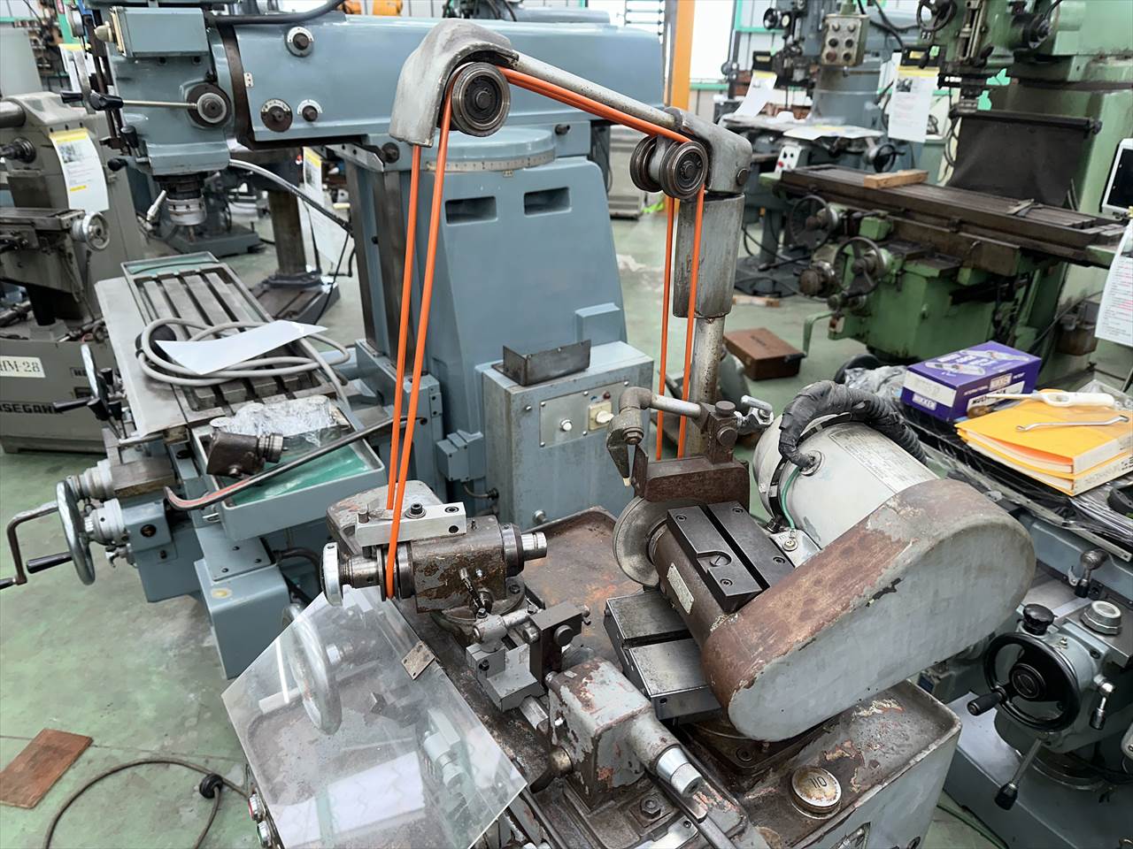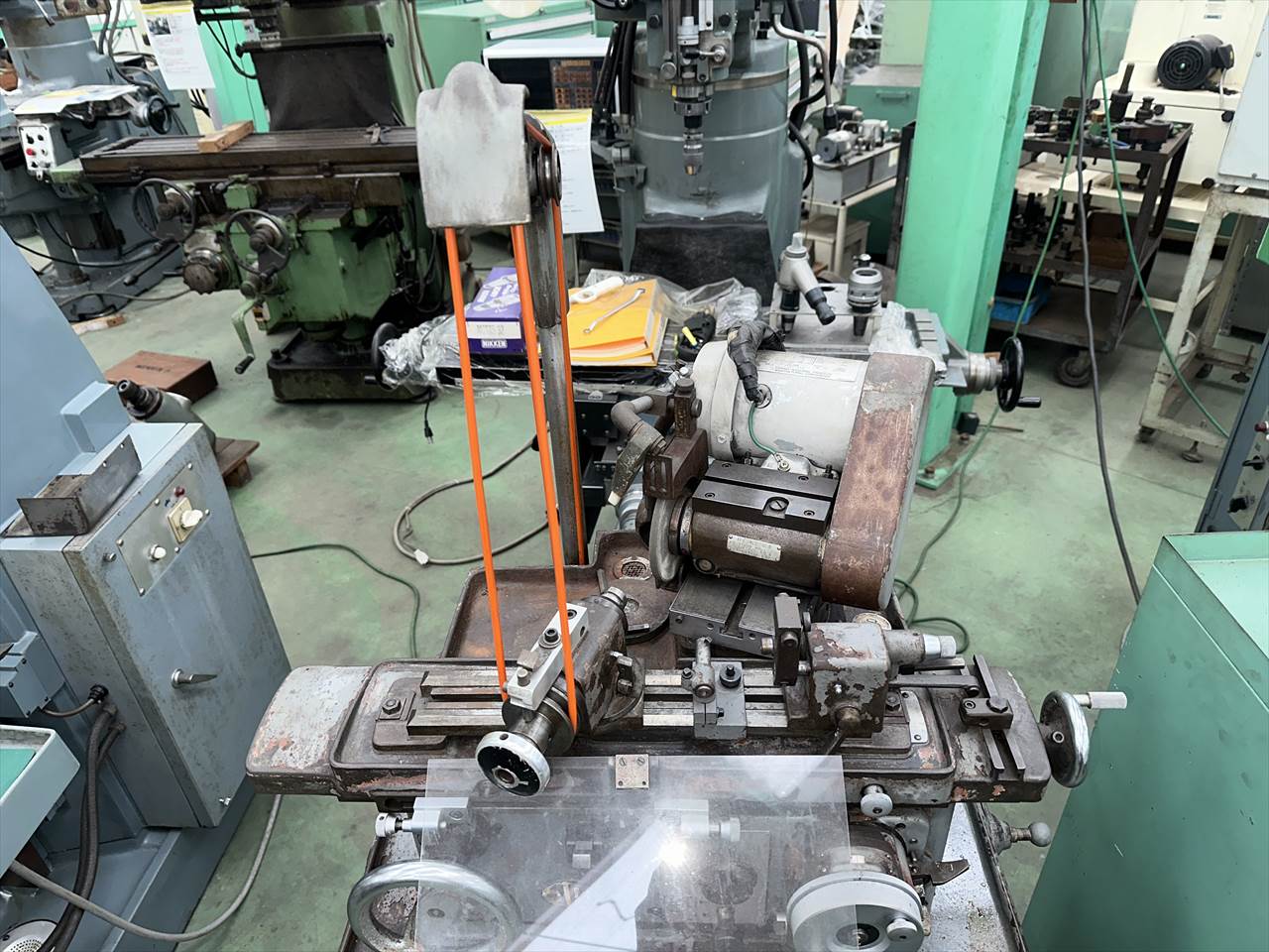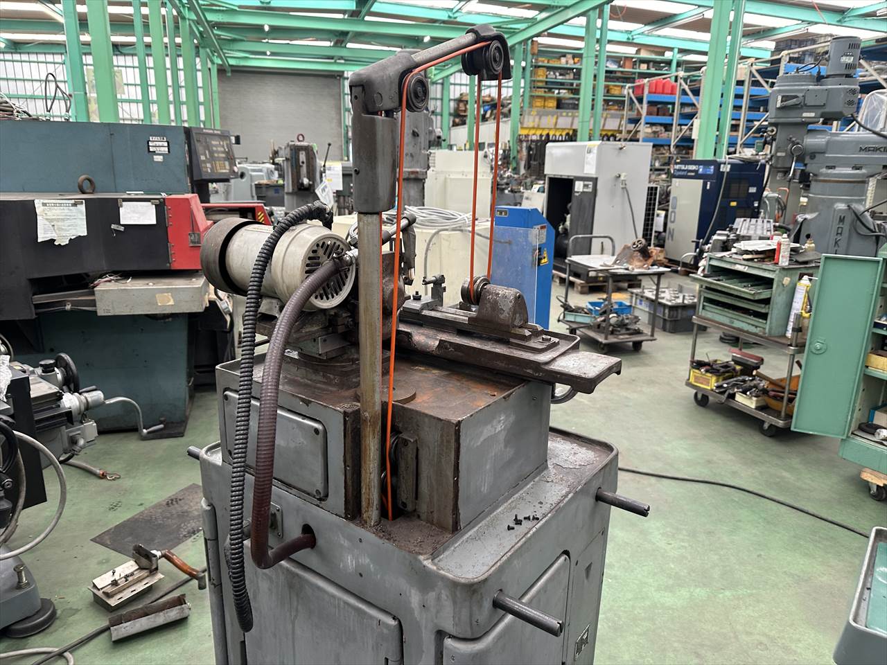 ○特徴  付属品多数(キャビネット付)  特に旋廻主軸台付きのため加工範囲が広い ○研削できる工作物  最大外径:φ35mm 最少外径:φ0.8mm  最大長さ:手動150mm 自動80mm ○機械の能力  センタ間の最大距離:150mm テーブル上の振り:φ105mm  コレットチャックの最大径:φ12mm(オプション旋廻主軸台) ○回転数  外径砥石車(50/60Hz):5000、6000rpm  主軸(5段):190、310、515、850、1400rpm ○砥石車  外径φ125×幅MAX13×内径φ19.5mm ○砥石台  前後方向の移動量:30mm 旋廻できる角度:±90°  ダイヤルの1目盛の読み:0.002mm ○テーブル  旋廻できる角度:±4.5°  左右方向の最大移動量:手動150 自動80mm  送り速度(3段):50~1120mm/min ○モータ  砥石車用:回転数3000/3600rpm(50/60Hz) 出力0.2kw2P  テーブル駆動用:回転数1500/1800rpm(50/60Hz) 出力0.2kw4P ○機械の大きさ  所要床面積:間口830×奥行710×高さ1520mm  床面から主軸中心までの高さ:1100mm 重量480㎏  工具キャビネット:間口500×奥行450×高さ1000mm