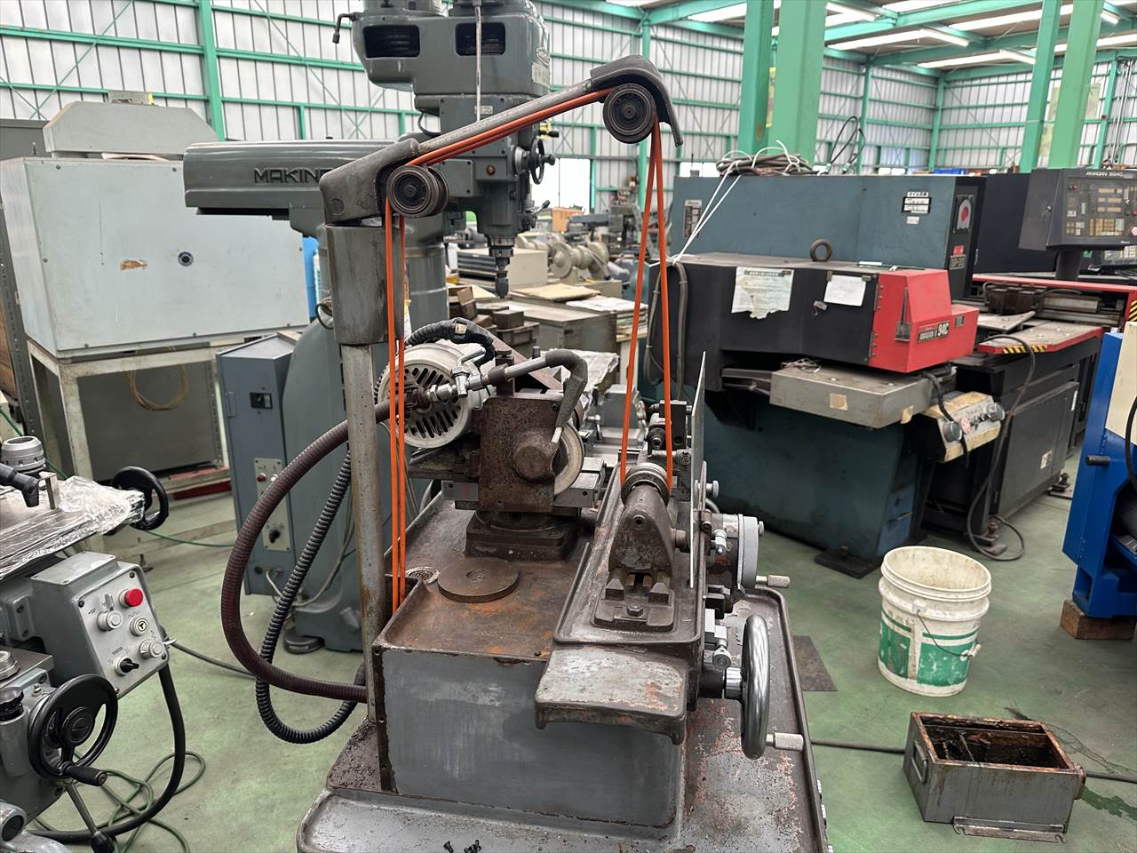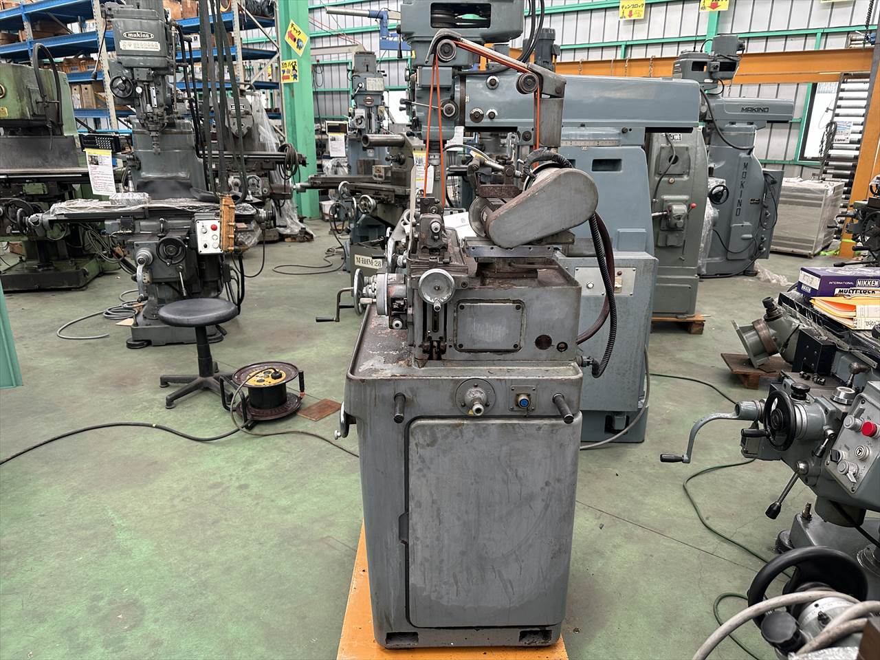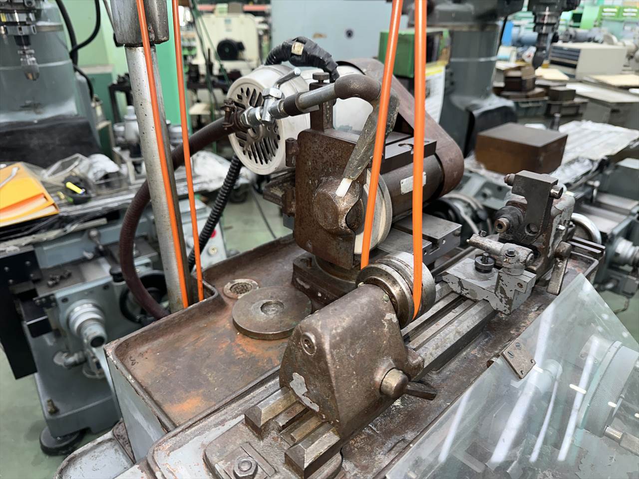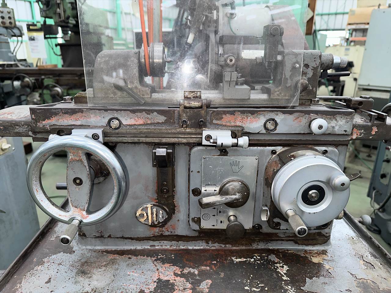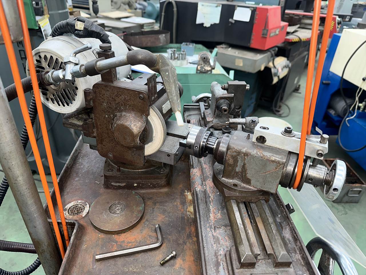○特徴  付属品多数(キャビネット付)  特に旋廻主軸台付きのため加工範囲が広い ○研削できる工作物  最大外径:φ35mm 最少外径:φ0.8mm  最大長さ:手動150mm 自動80mm ○機械の能力  センタ間の最大距離:150mm テーブル上の振り:φ105mm  コレットチャックの最大径:φ12mm(オプション旋廻主軸台) ○回転数  外径砥石車(50/60Hz):5000、6000rpm  主軸(5段):190、310、515、850、1400rpm ○砥石車  外径φ125×幅MAX13×内径φ19.5mm ○砥石台  前後方向の移動量:30mm 旋廻できる角度:±90°  ダイヤルの1目盛の読み:0.002mm ○テーブル  旋廻できる角度:±4.5°  左右方向の最大移動量:手動150 自動80mm  送り速度(3段):50~1120mm/min ○モータ  砥石車用:回転数3000/3600rpm(50/60Hz) 出力0.2kw2P  テーブル駆動用:回転数1500/1800rpm(50/60Hz) 出力0.2kw4P ○機械の大きさ  所要床面積:間口830×奥行710×高さ1520mm  床面から主軸中心までの高さ:1100mm 重量480㎏  工具キャビネット:間口500×奥行450×高さ1000mm