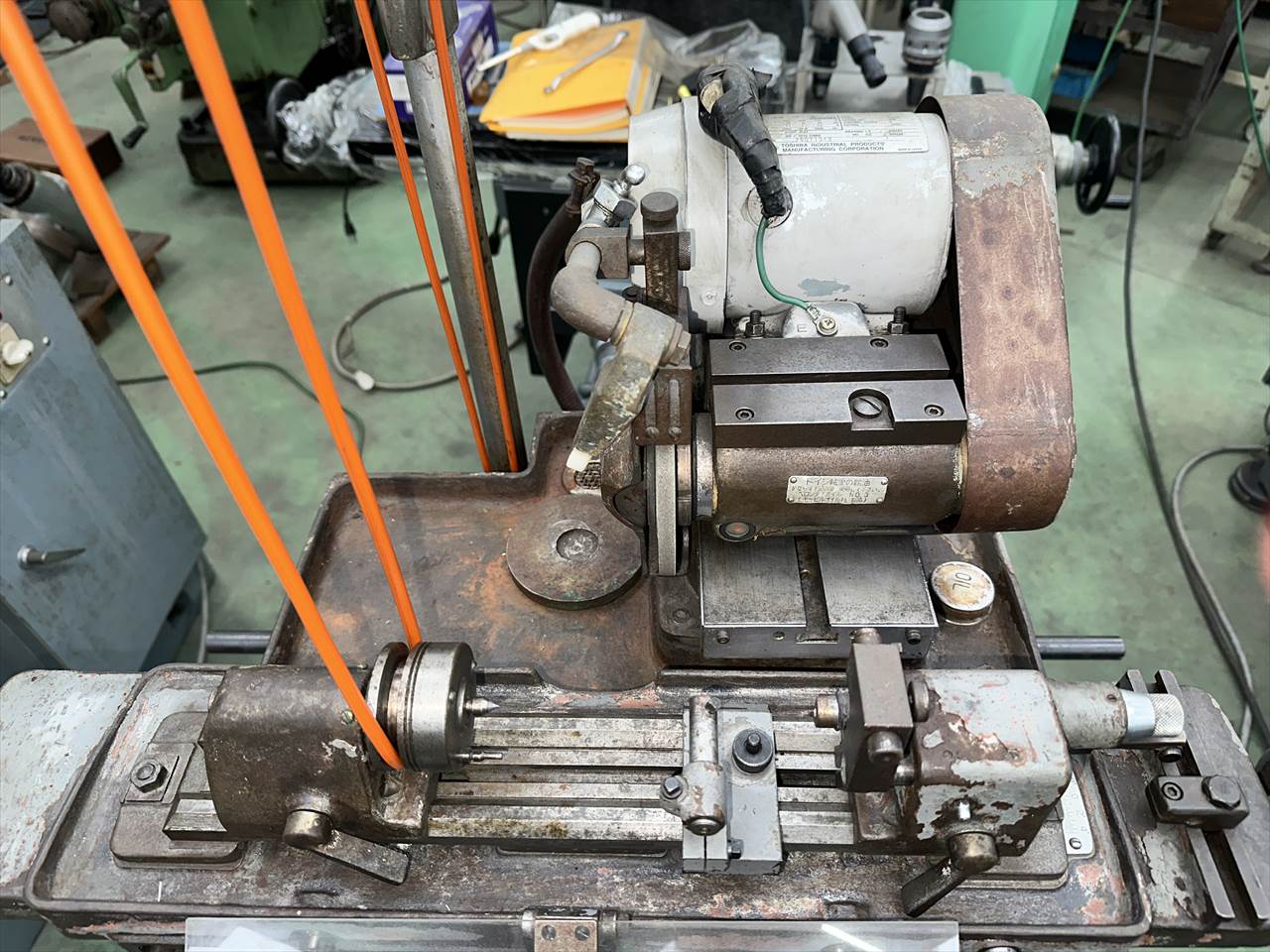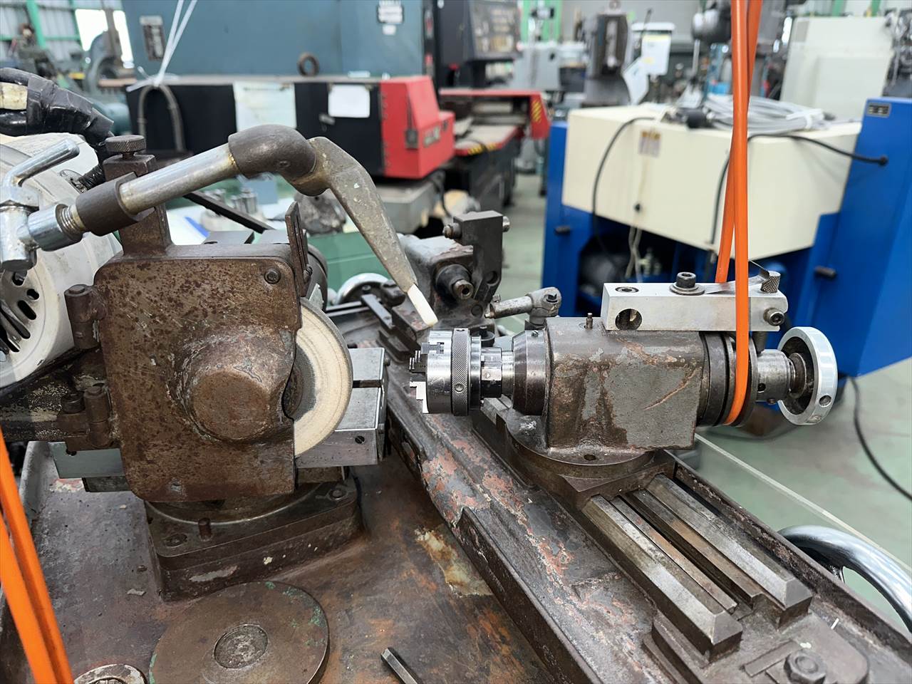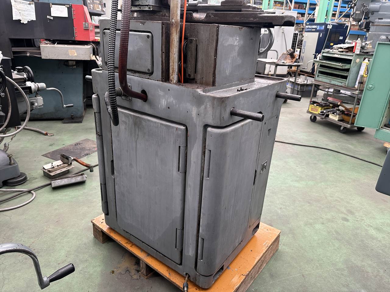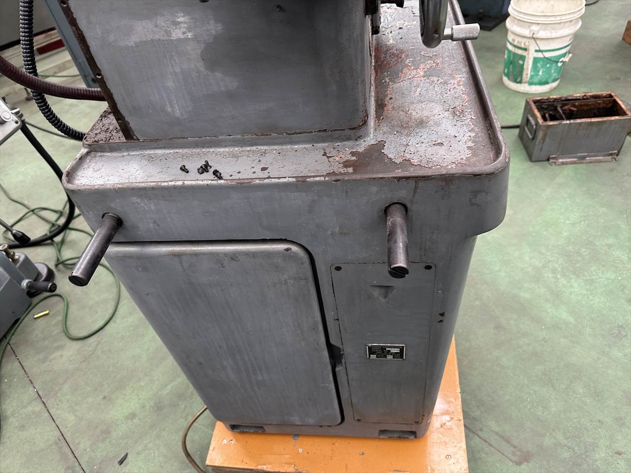 ○特徴  付属品多数(キャビネット付)  特に旋廻主軸台付きのため加工範囲が広い ○研削できる工作物  最大外径:φ35mm 最少外径:φ0.8mm  最大長さ:手動150mm 自動80mm ○機械の能力  センタ間の最大距離:150mm テーブル上の振り:φ105mm  コレットチャックの最大径:φ12mm(オプション旋廻主軸台) ○回転数  外径砥石車(50/60Hz):5000、6000rpm  主軸(5段):190、310、515、850、1400rpm ○砥石車  外径φ125×幅MAX13×内径φ19.5mm ○砥石台  前後方向の移動量:30mm 旋廻できる角度:±90°  ダイヤルの1目盛の読み:0.002mm ○テーブル  旋廻できる角度:±4.5°  左右方向の最大移動量:手動150 自動80mm  送り速度(3段):50~1120mm/min ○モータ  砥石車用:回転数3000/3600rpm(50/60Hz) 出力0.2kw2P  テーブル駆動用:回転数1500/1800rpm(50/60Hz) 出力0.2kw4P ○機械の大きさ  所要床面積:間口830×奥行710×高さ1520mm  床面から主軸中心までの高さ:1100mm 重量480㎏  工具キャビネット:間口500×奥行450×高さ1000mm