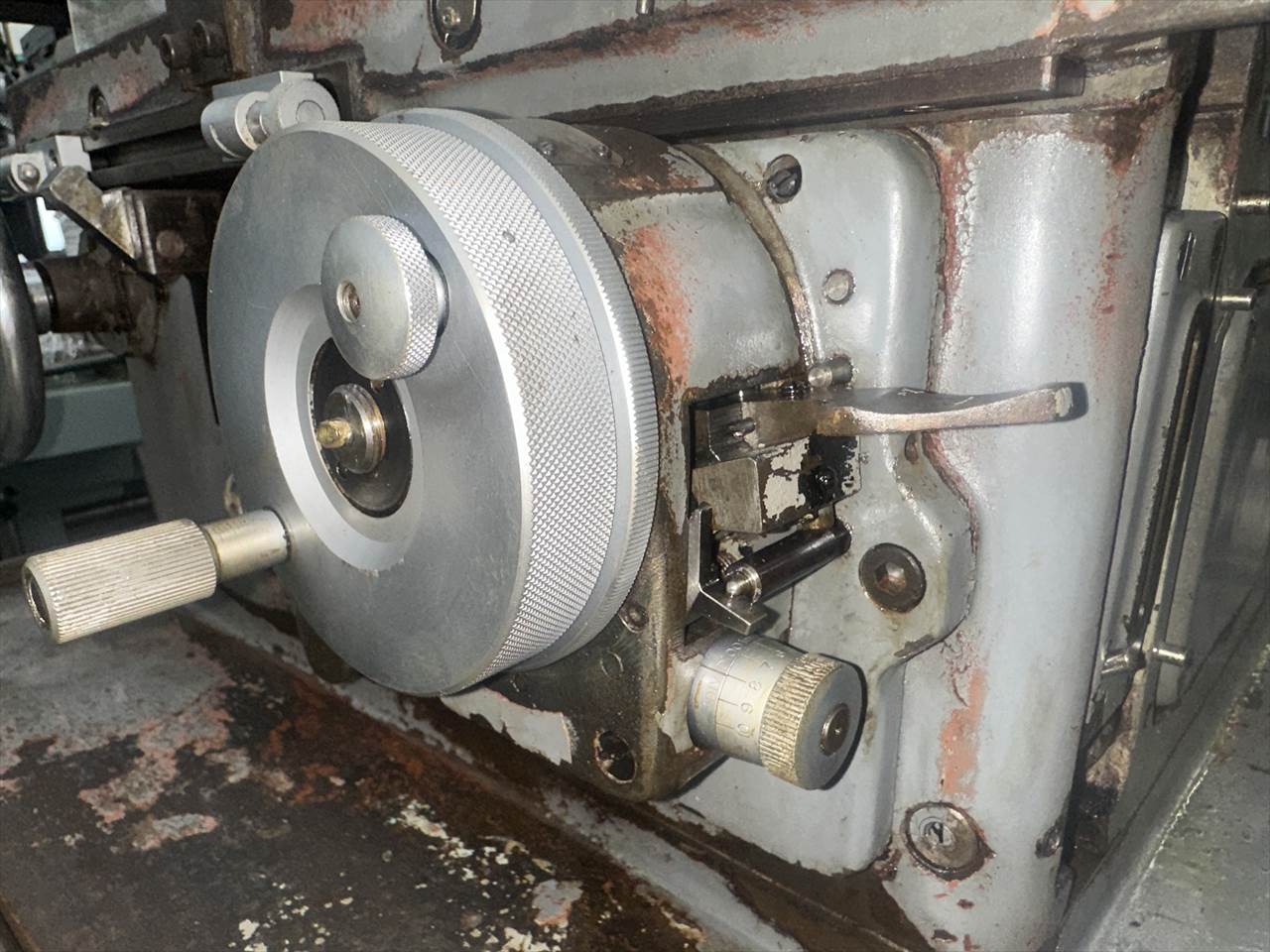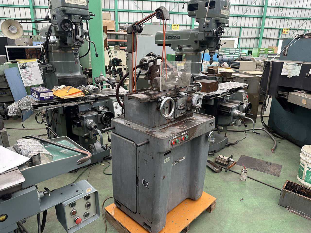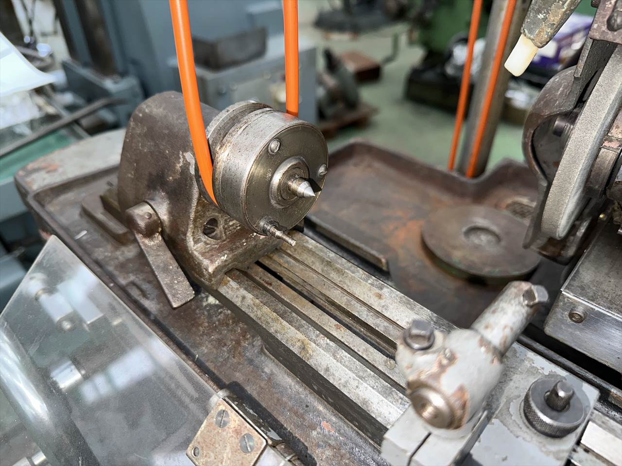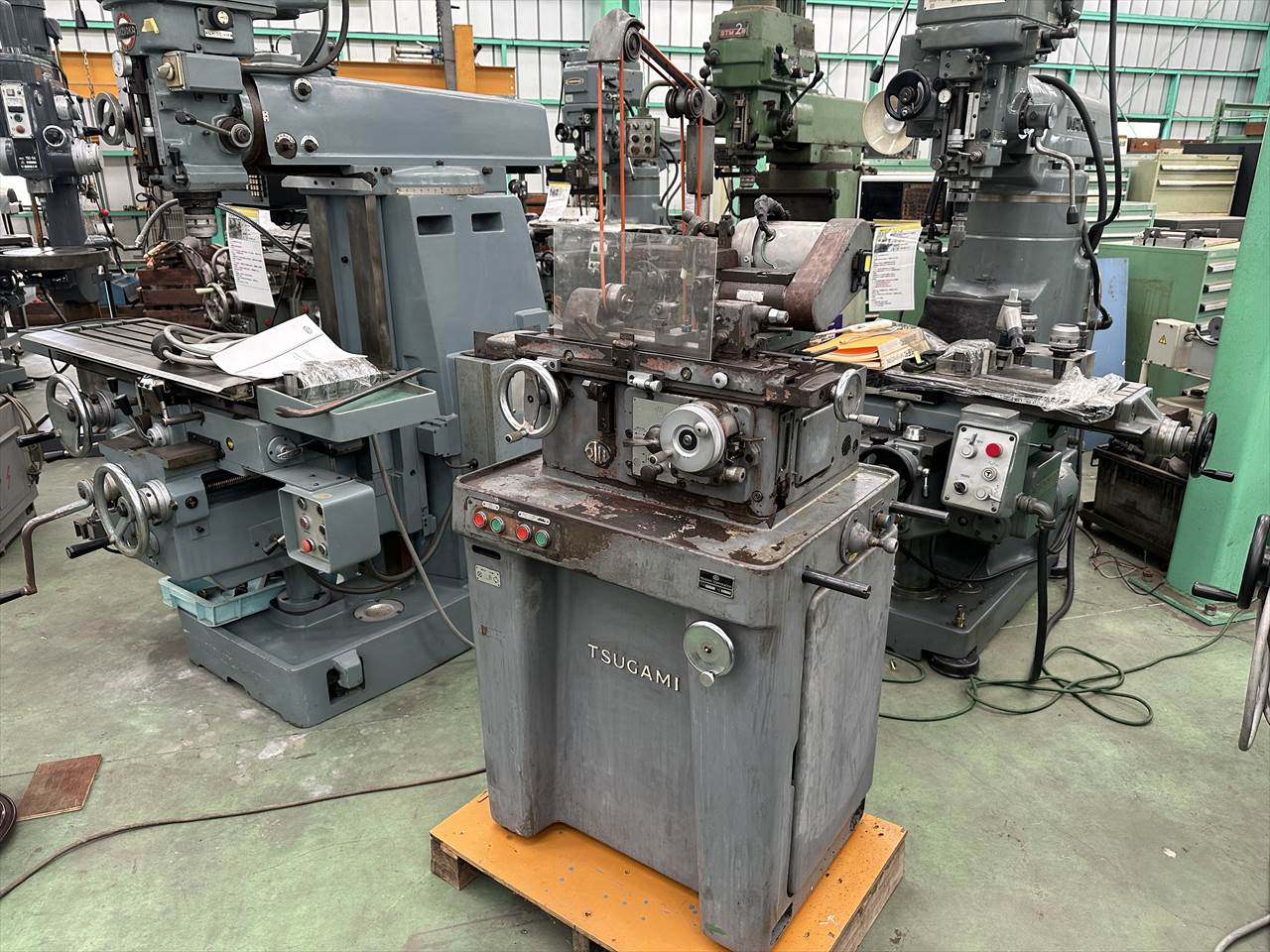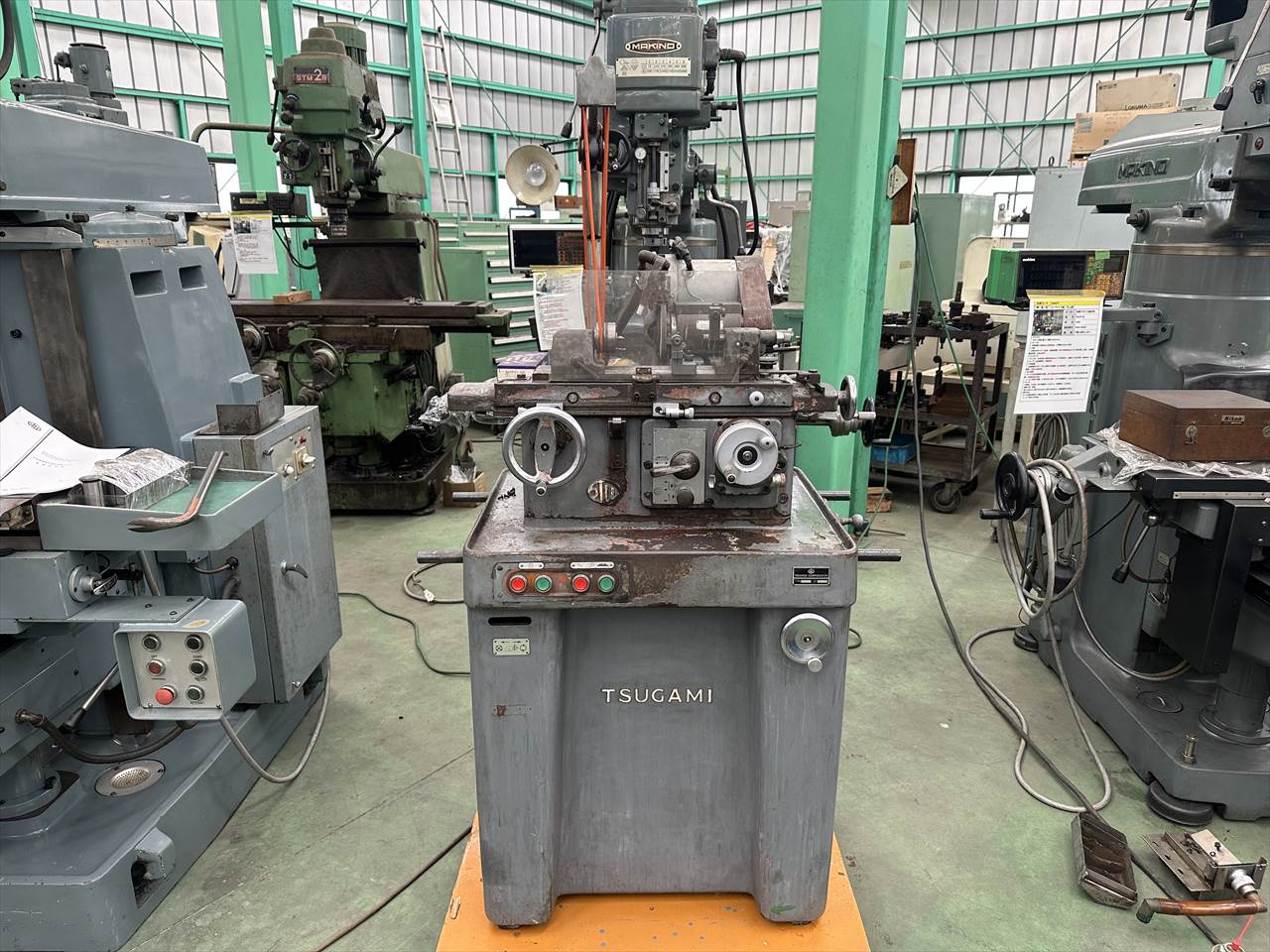 ○特徴  付属品多数(キャビネット付)  特に旋廻主軸台付きのため加工範囲が広い ○研削できる工作物  最大外径:φ35mm 最少外径:φ0.8mm  最大長さ:手動150mm 自動80mm ○機械の能力  センタ間の最大距離:150mm テーブル上の振り:φ105mm  コレットチャックの最大径:φ12mm(オプション旋廻主軸台) ○回転数  外径砥石車(50/60Hz):5000、6000rpm  主軸(5段):190、310、515、850、1400rpm ○砥石車  外径φ125×幅MAX13×内径φ19.5mm ○砥石台  前後方向の移動量:30mm 旋廻できる角度:±90°  ダイヤルの1目盛の読み:0.002mm ○テーブル  旋廻できる角度:±4.5°  左右方向の最大移動量:手動150 自動80mm  送り速度(3段):50~1120mm/min ○モータ  砥石車用:回転数3000/3600rpm(50/60Hz) 出力0.2kw2P  テーブル駆動用:回転数1500/1800rpm(50/60Hz) 出力0.2kw4P ○機械の大きさ  所要床面積:間口830×奥行710×高さ1520mm  床面から主軸中心までの高さ:1100mm 重量480㎏  工具キャビネット:間口500×奥行450×高さ1000mm