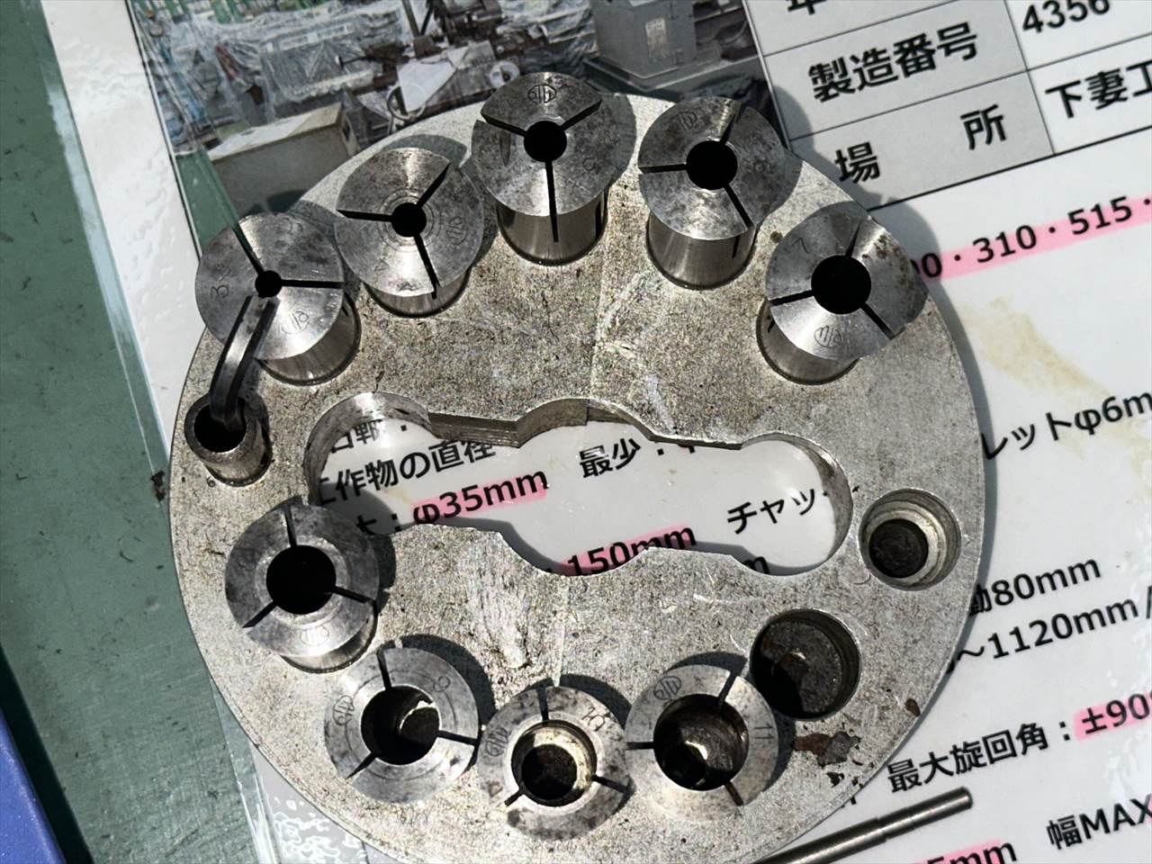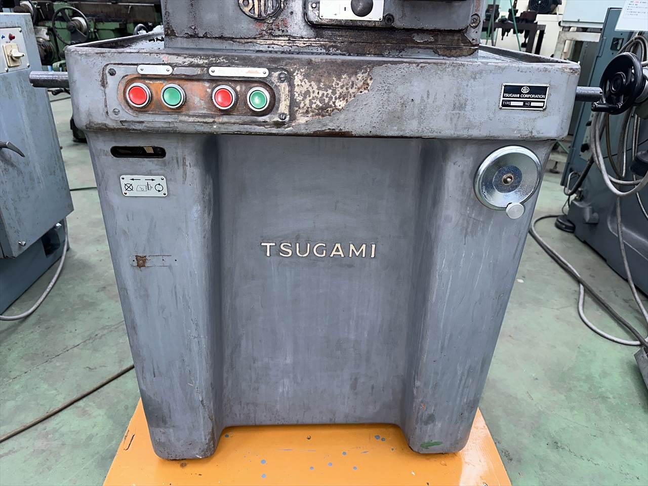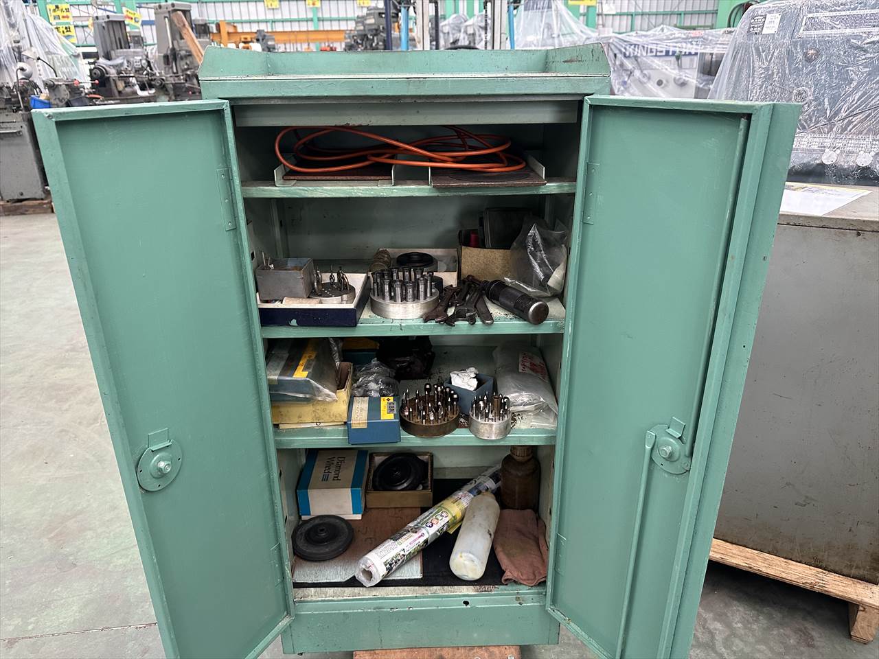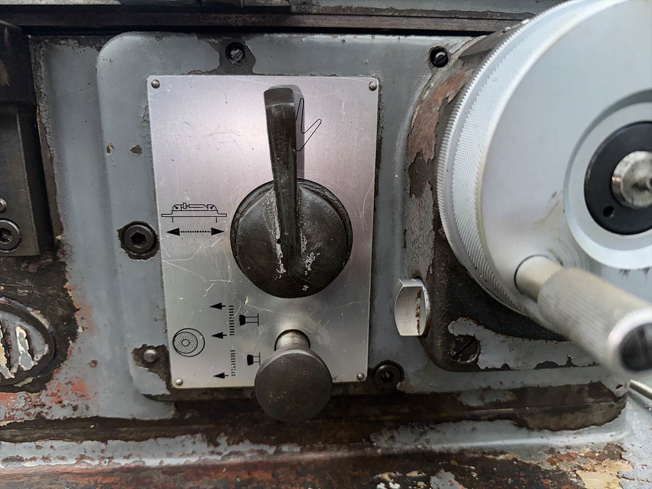 ○特徴  付属品多数(キャビネット付)  特に旋廻主軸台付きのため加工範囲が広い ○研削できる工作物  最大外径:φ35mm 最少外径:φ0.8mm  最大長さ:手動150mm 自動80mm ○機械の能力  センタ間の最大距離:150mm テーブル上の振り:φ105mm  コレットチャックの最大径:φ12mm(オプション旋廻主軸台) ○回転数  外径砥石車(50/60Hz):5000、6000rpm  主軸(5段):190、310、515、850、1400rpm ○砥石車  外径φ125×幅MAX13×内径φ19.5mm ○砥石台  前後方向の移動量:30mm 旋廻できる角度:±90°  ダイヤルの1目盛の読み:0.002mm ○テーブル  旋廻できる角度:±4.5°  左右方向の最大移動量:手動150 自動80mm  送り速度(3段):50~1120mm/min ○モータ  砥石車用:回転数3000/3600rpm(50/60Hz) 出力0.2kw2P  テーブル駆動用:回転数1500/1800rpm(50/60Hz) 出力0.2kw4P ○機械の大きさ  所要床面積:間口830×奥行710×高さ1520mm  床面から主軸中心までの高さ:1100mm 重量480㎏  工具キャビネット:間口500×奥行450×高さ1000mm