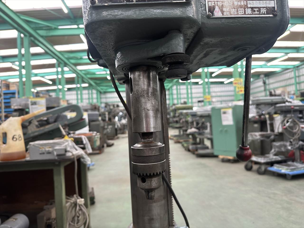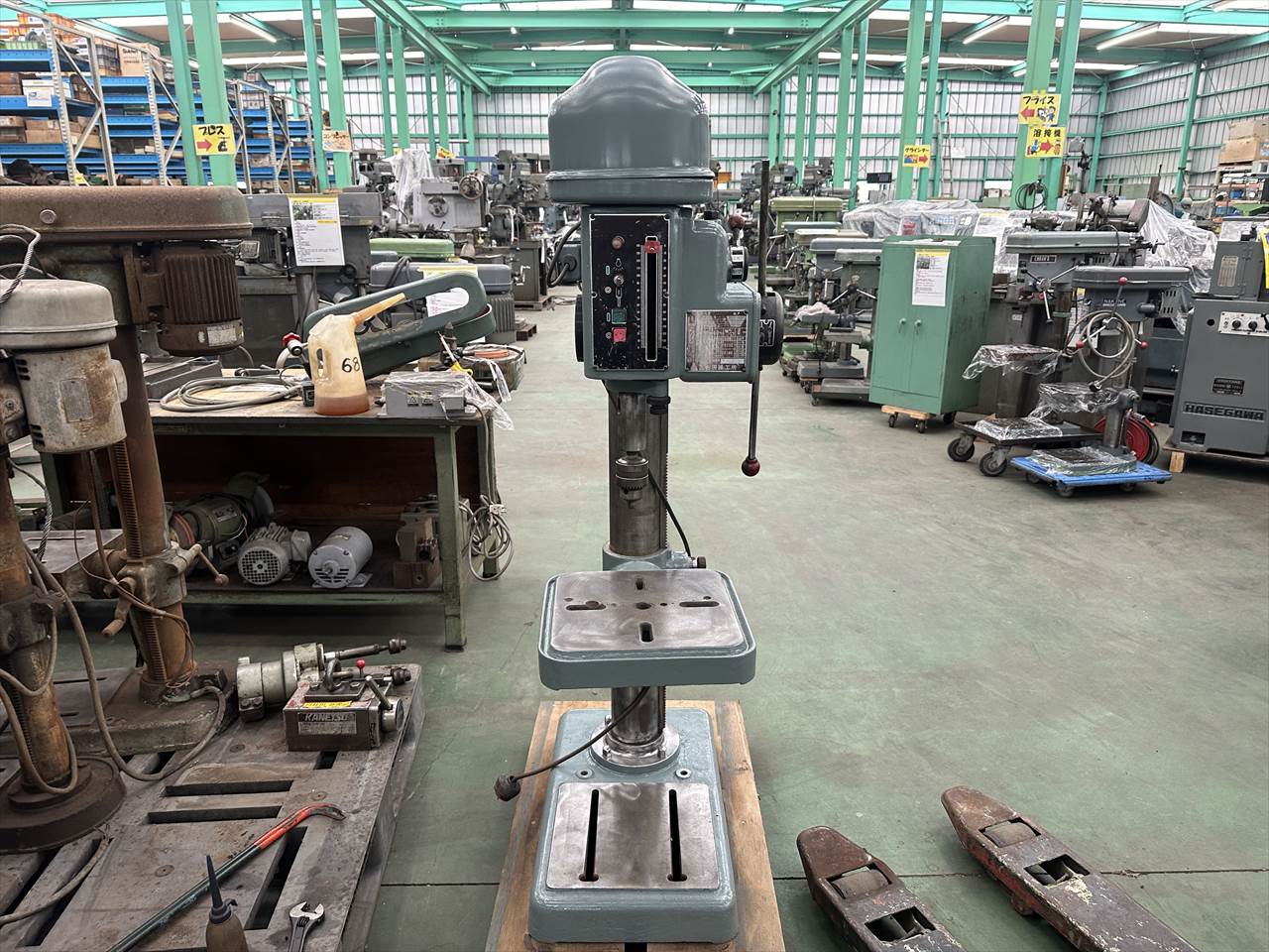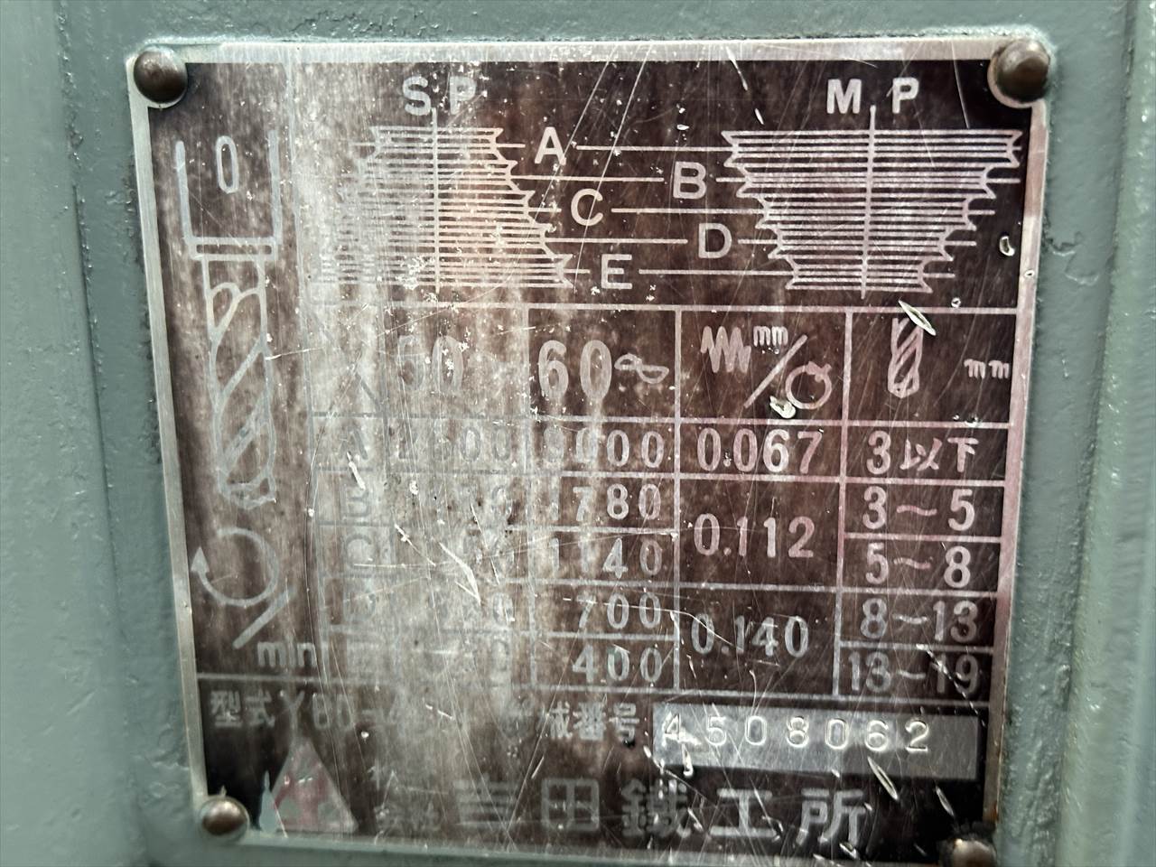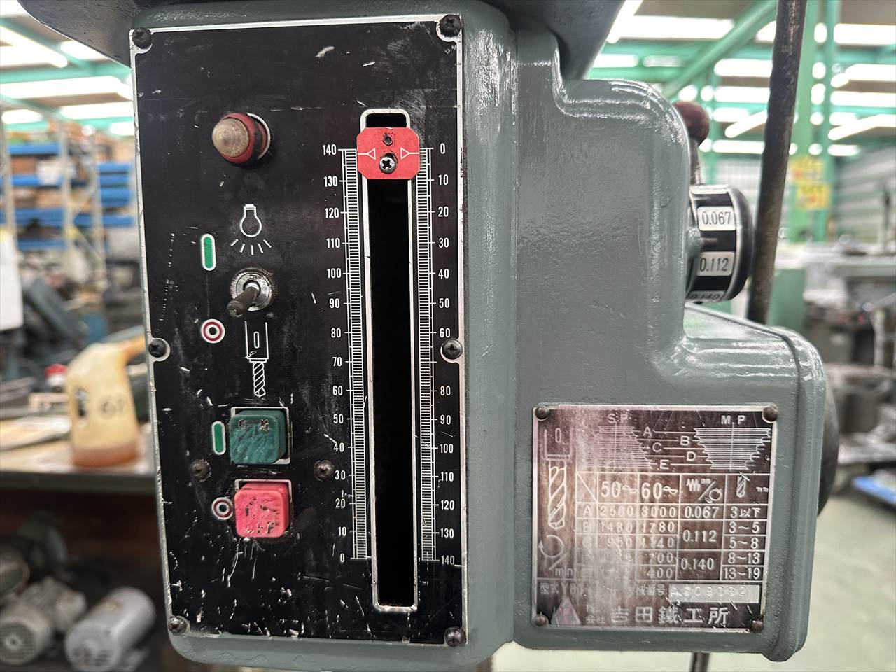 主モーター0.75kW 機械重量160kg 主軸穴のテーパーM.T.№2 穴あけ能力(鋼で)φ90 振りφ450 主軸端面からテーブル上面までの距離