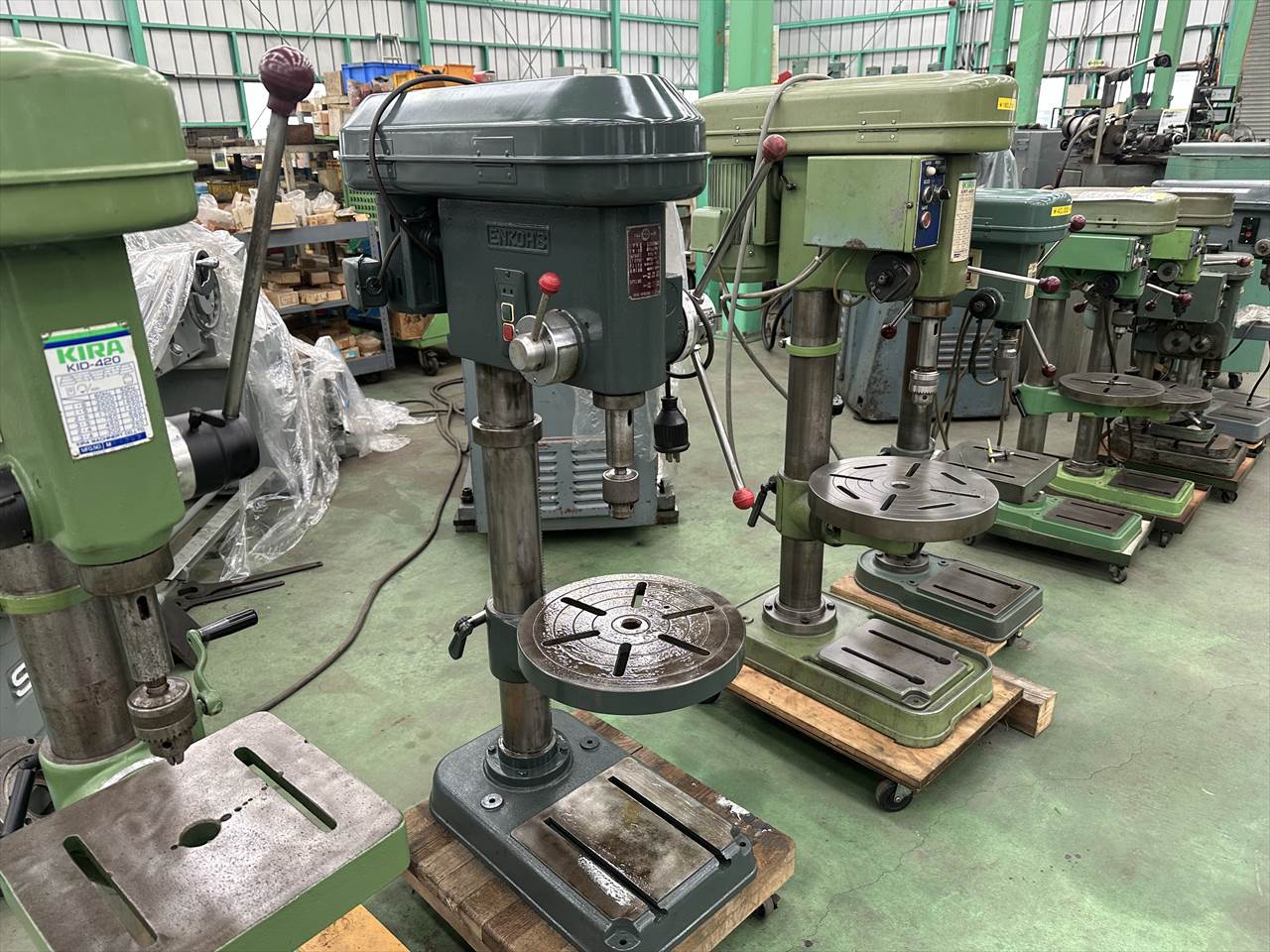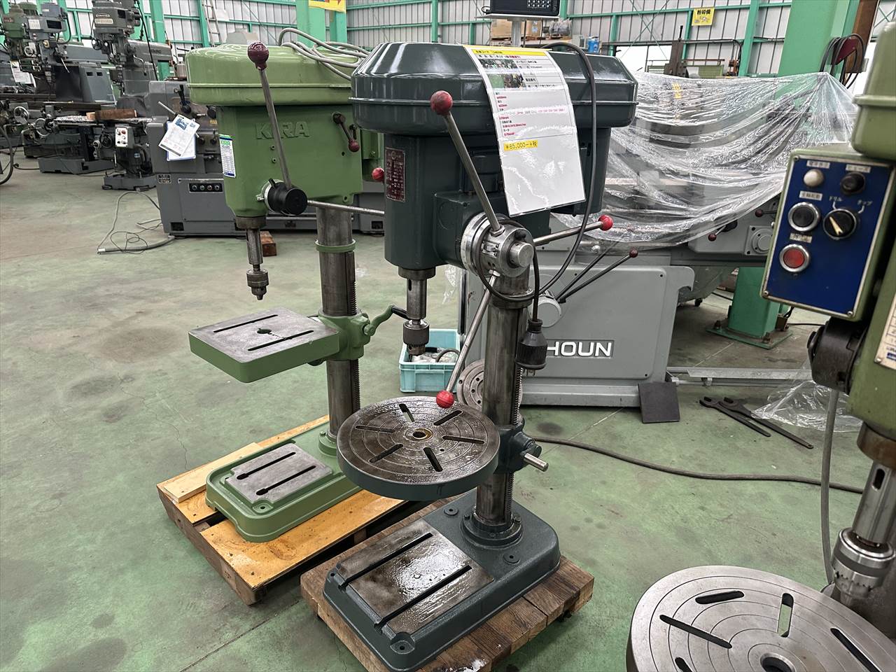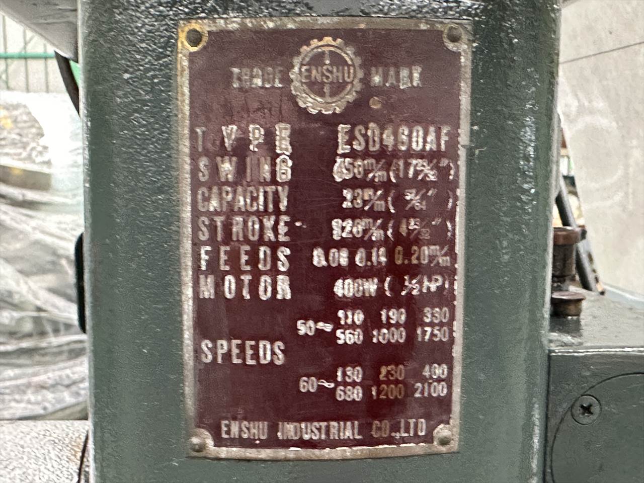 ○振り  φ450mm ○能力  φ23mm ○主軸  1上下ストローク:20mm 回転数(50Hz):110・190・330・560・1000・1750rpm ○自動送り量  0.08-0.14-0.20mm/rev ○モータ  0.75kw4P