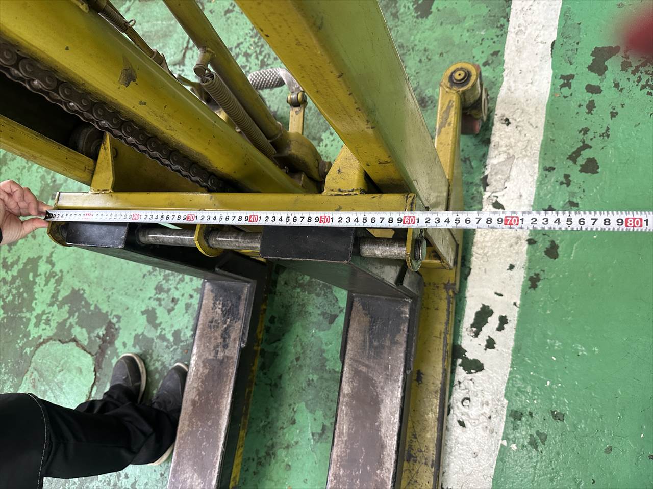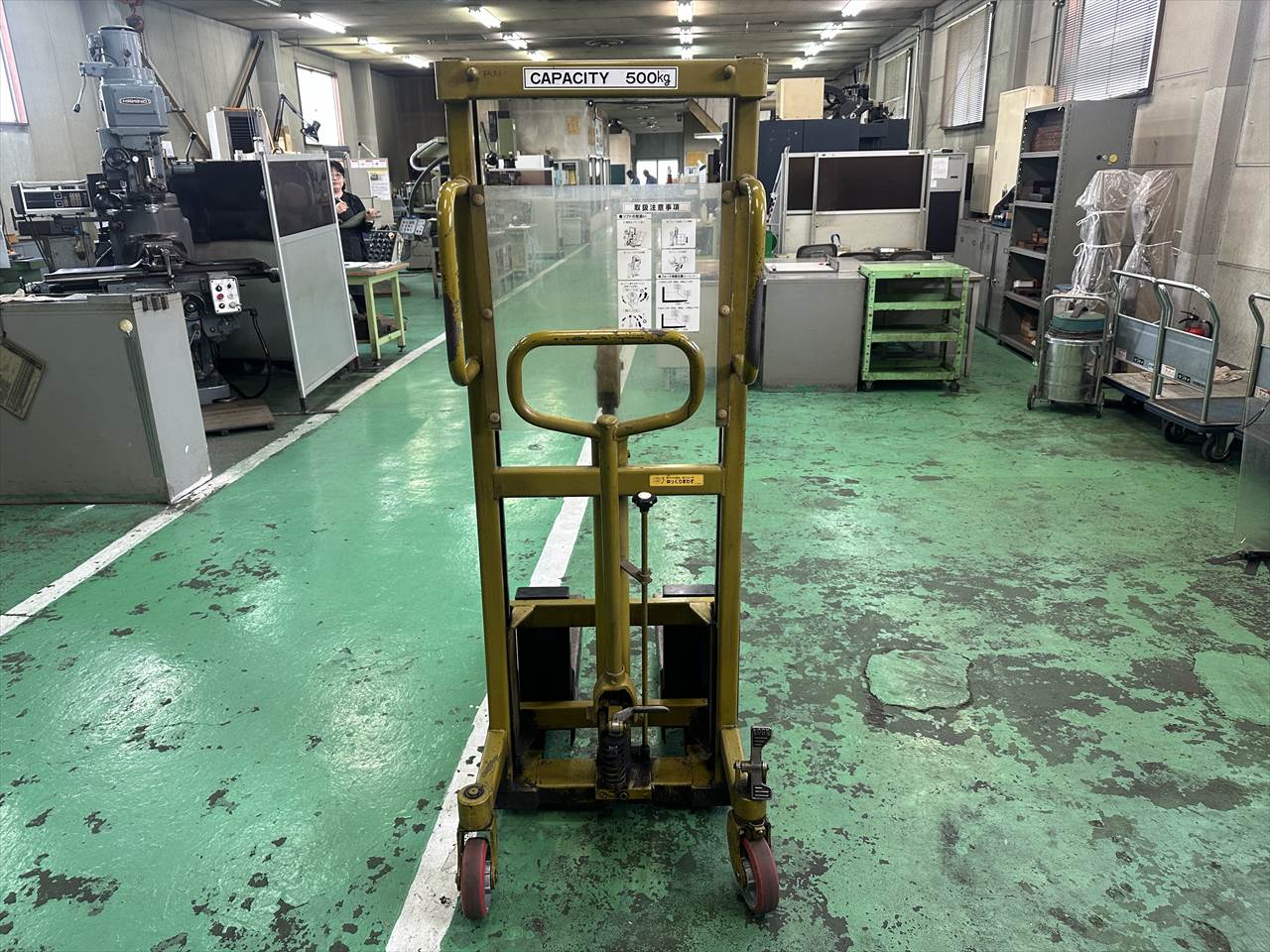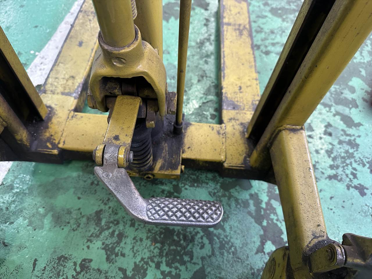 ○能力  最大積載質量:500㎏ 最低位:80mm 最高位:1200mm フォーク長さ:650mm フォークロードセンター:350mm  フォークスライド外幅:215~575mm ○動力源  油圧足踏み ○ホイール  セテアリング:ゴムφ150×幅40mm ロード:ウレタンφ80×幅38mm ○機械の大きさ  全幅625×全長1180×全高1600mm 車体質量:96㎏