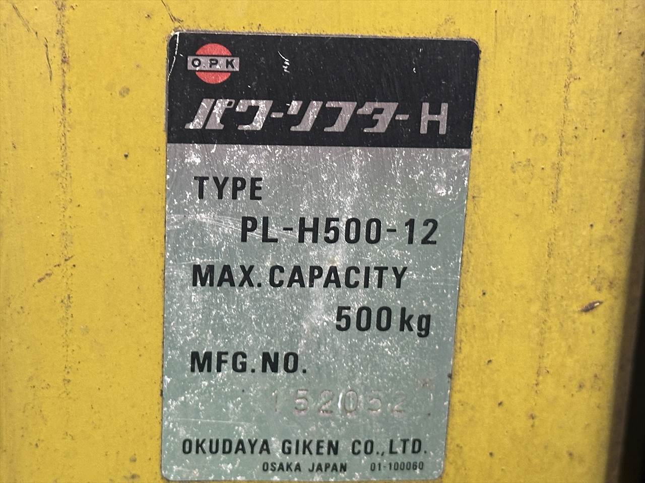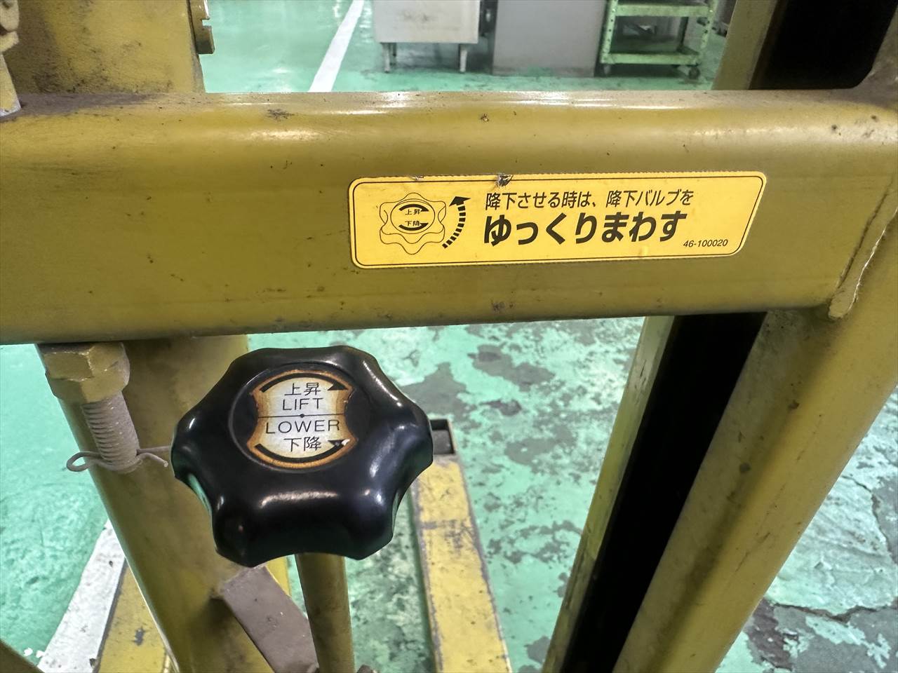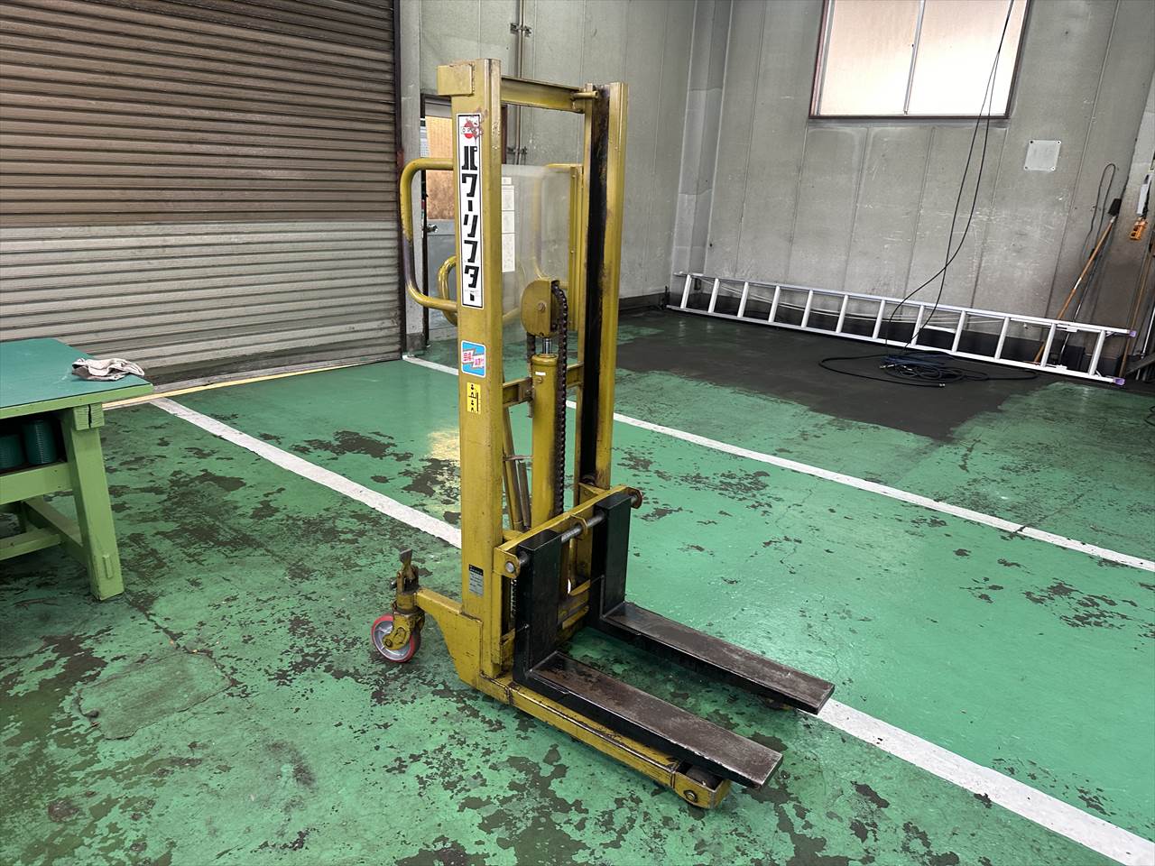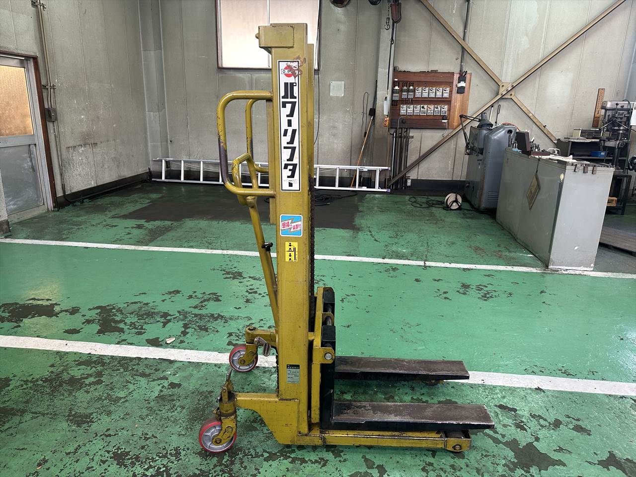 ○能力  最大積載質量:500㎏ 最低位:80mm 最高位:1200mm フォーク長さ:650mm フォークロードセンター:350mm  フォークスライド外幅:215~575mm ○動力源  油圧足踏み ○ホイール  セテアリング:ゴムφ150×幅40mm ロード:ウレタンφ80×幅38mm ○機械の大きさ  全幅625×全長1180×全高1600mm 車体質量:96㎏