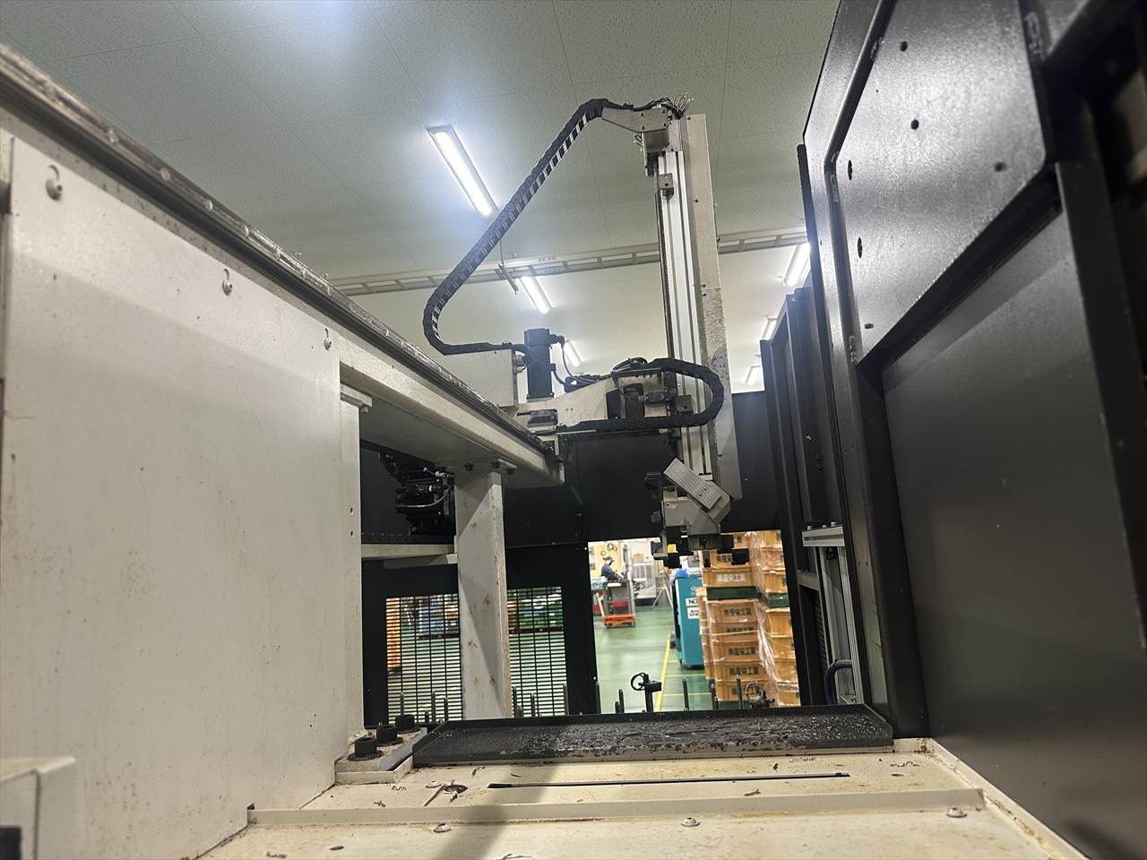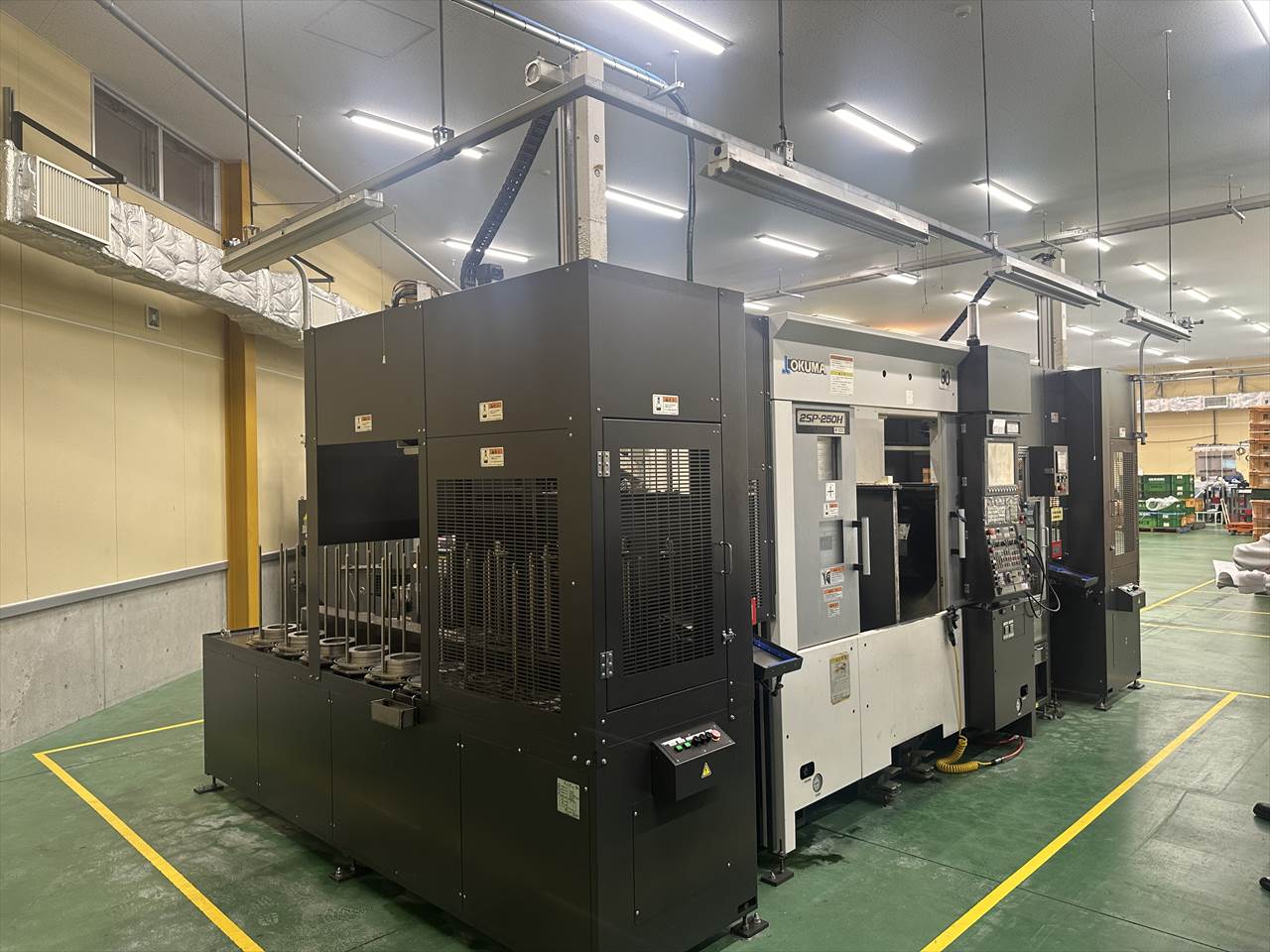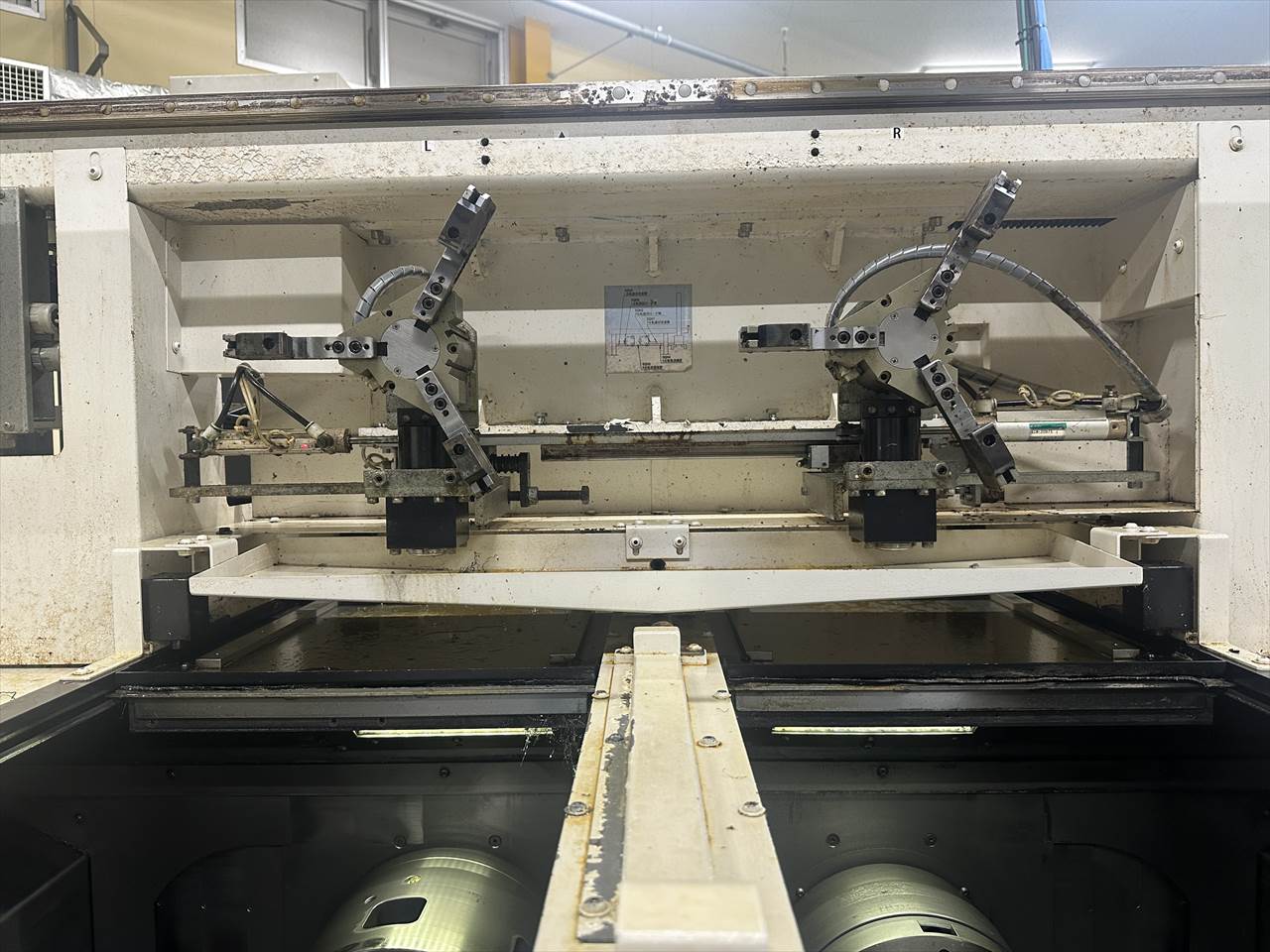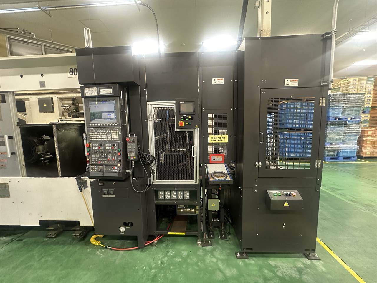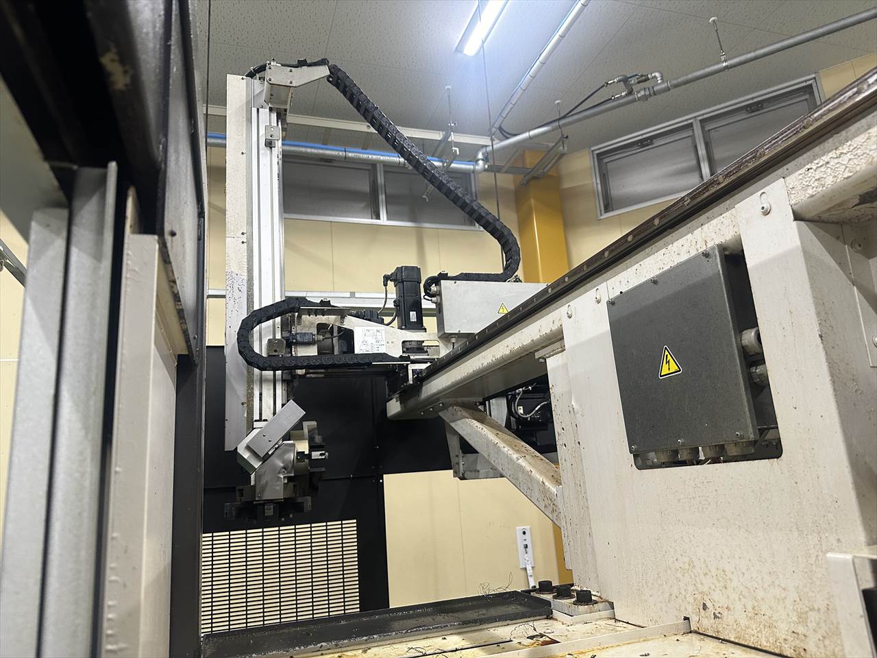 ○特徴  NC装置:OSP P300LA チャック:帝国製コレット 回転シリンダ:北川製F0933  左ストッカ→仮置きNGシュータ→本体→機外計測→NGシュータ→右ストッカ  ○能力・容量  主軸間距離:450mm 標準チャック:8インチ(※現在は特殊チャック)  最大加工径φ250×長さ60mm(本機能力φ350×200mm) 制御軸数:4軸 ○移動量  X軸:200mm Z軸:200mm 早送り速度:X・Z軸24m/min(スベリガイド) ○主軸  回転速度:32~3200rpm(無段) 主軸端:JIS A2-6  軸受内径:φ100mm 貫通穴:φ62mm ○刃物台  形式:V12 工具取付本数:12本 外径バイト:□25mm 内径工具:φ40mm ○モータ  主軸用:18.5/15(30分/連続)×2 送り軸用:(X軸)BL3kw×2(Z軸)BL2.9kw×2 ○ローダ(反転装置付)  ワーク可搬サイズ:φ250×L60mm φ200×85mm 可搬質量:8㎏×2  駆動方式:3軸サーボ(X・Y・Z)  動作範囲:X軸4230mm(ビーム両側出しの場合) Y軸:645mm Z軸:290mm  早送り速度:X軸120 Y軸100 Z軸40m/min  ローダハンド(エアープッシャー付):3爪チャック 爪ストロークφ32mm  反転ハンド:3爪チャック 爪ストロークφ32mm ○ワークテーブル  ワークサイズ:φ40~φ250mm パレット数:16  段積み高さ:450mm ワーク積載質量:50㎏/パレット ○機械の大きさ(ローダ・ストッカー・計測装置・コンベア・高圧クーラントを含む)  幅5430×奥行4000×高さ3093mm(ローダー最大高さ) 重量:8000㎏