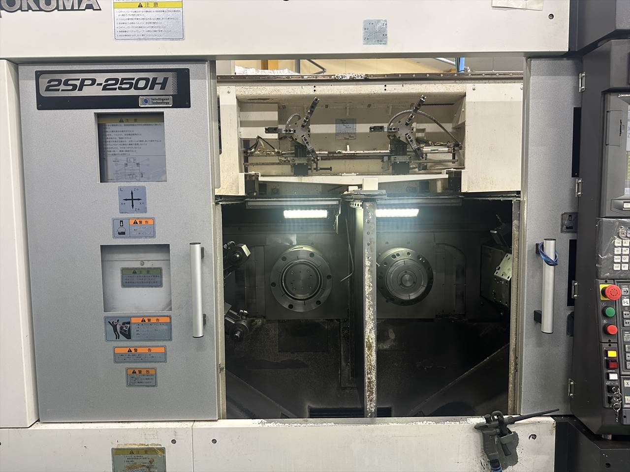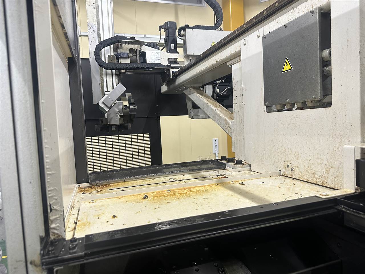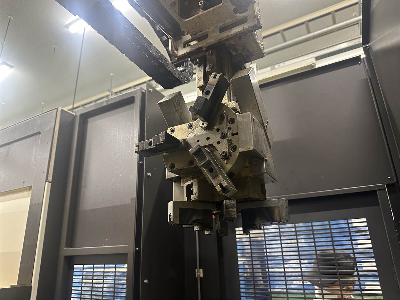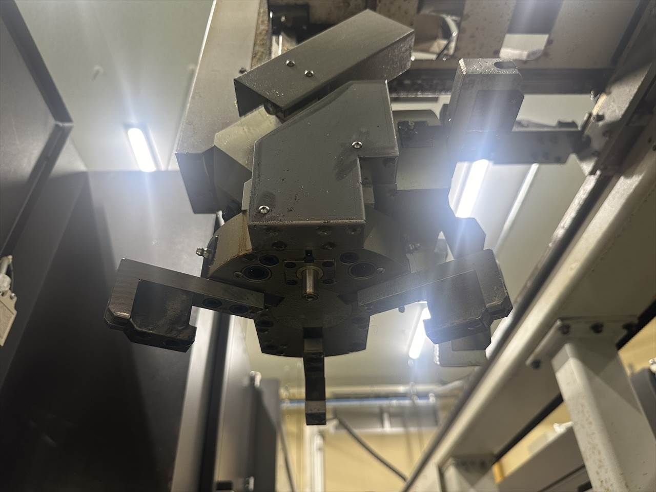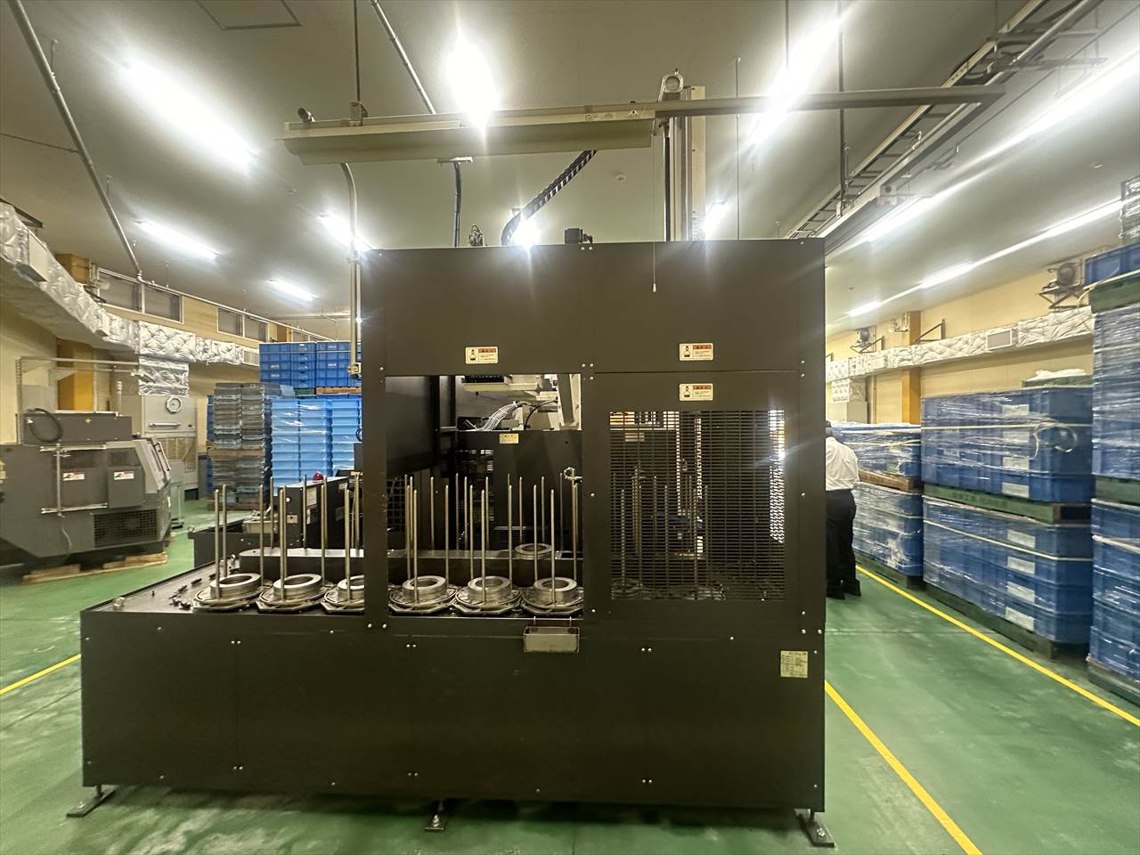 ○特徴  NC装置:OSP P300LA チャック:帝国製コレット 回転シリンダ:北川製F0933  左ストッカ→仮置きNGシュータ→本体→機外計測→NGシュータ→右ストッカ  ○能力・容量  主軸間距離:450mm 標準チャック:8インチ(※現在は特殊チャック)  最大加工径φ250×長さ60mm(本機能力φ350×200mm) 制御軸数:4軸 ○移動量  X軸:200mm Z軸:200mm 早送り速度:X・Z軸24m/min(スベリガイド) ○主軸  回転速度:32~3200rpm(無段) 主軸端:JIS A2-6  軸受内径:φ100mm 貫通穴:φ62mm ○刃物台  形式:V12 工具取付本数:12本 外径バイト:□25mm 内径工具:φ40mm ○モータ  主軸用:18.5/15(30分/連続)×2 送り軸用:(X軸)BL3kw×2(Z軸)BL2.9kw×2 ○ローダ(反転装置付)  ワーク可搬サイズ:φ250×L60mm φ200×85mm 可搬質量:8㎏×2  駆動方式:3軸サーボ(X・Y・Z)  動作範囲:X軸4230mm(ビーム両側出しの場合) Y軸:645mm Z軸:290mm  早送り速度:X軸120 Y軸100 Z軸40m/min  ローダハンド(エアープッシャー付):3爪チャック 爪ストロークφ32mm  反転ハンド:3爪チャック 爪ストロークφ32mm ○ワークテーブル  ワークサイズ:φ40~φ250mm パレット数:16  段積み高さ:450mm ワーク積載質量:50㎏/パレット ○機械の大きさ(ローダ・ストッカー・計測装置・コンベア・高圧クーラントを含む)  幅5430×奥行4000×高さ3093mm(ローダー最大高さ) 重量:8000㎏
