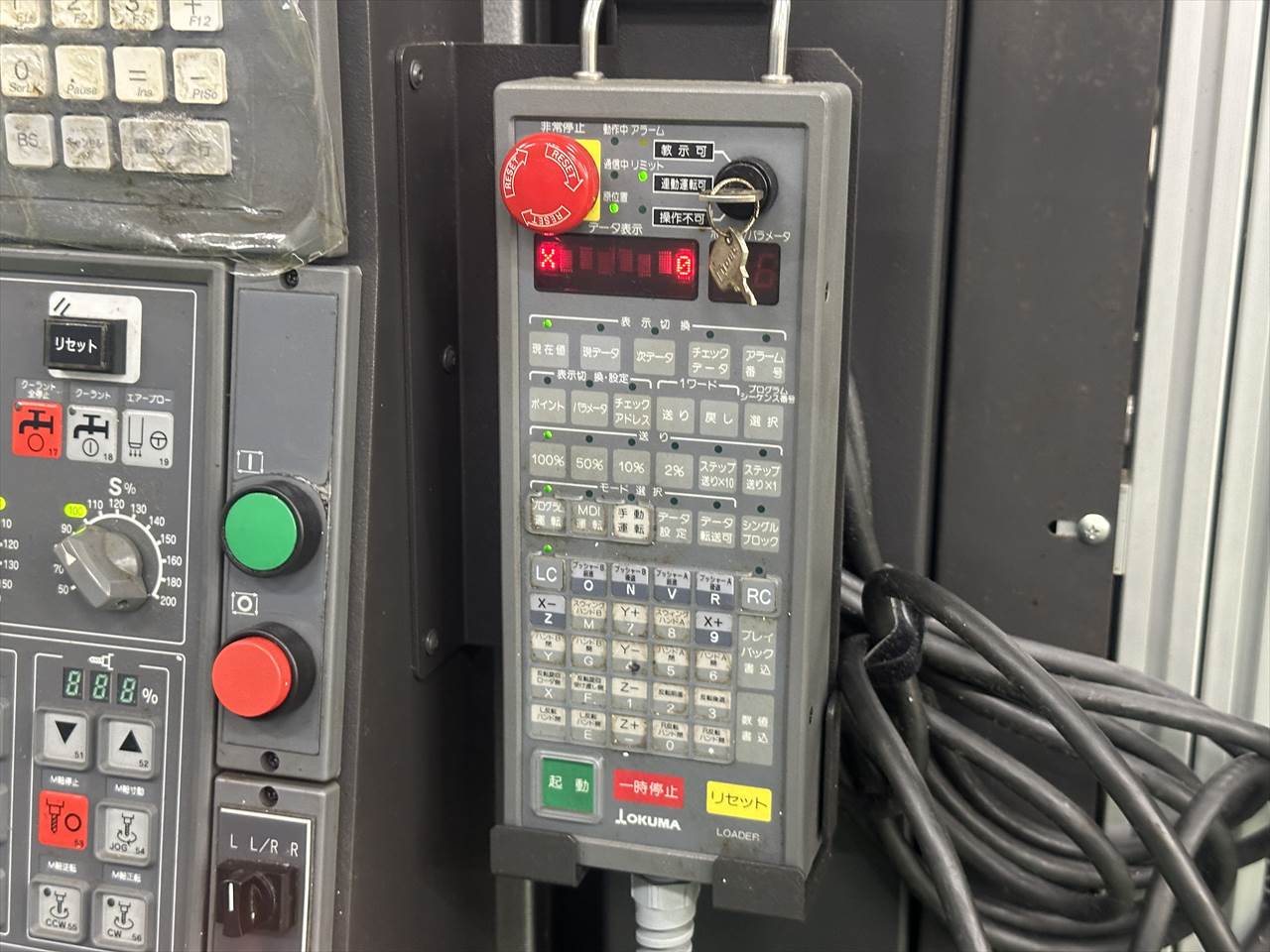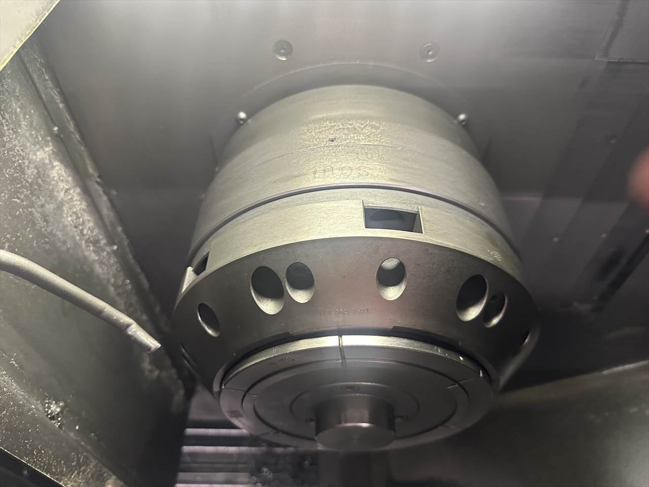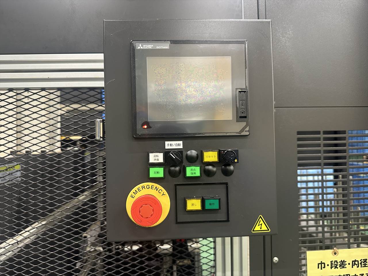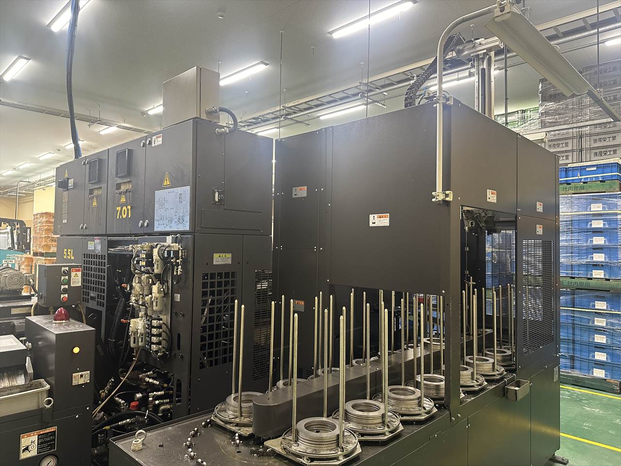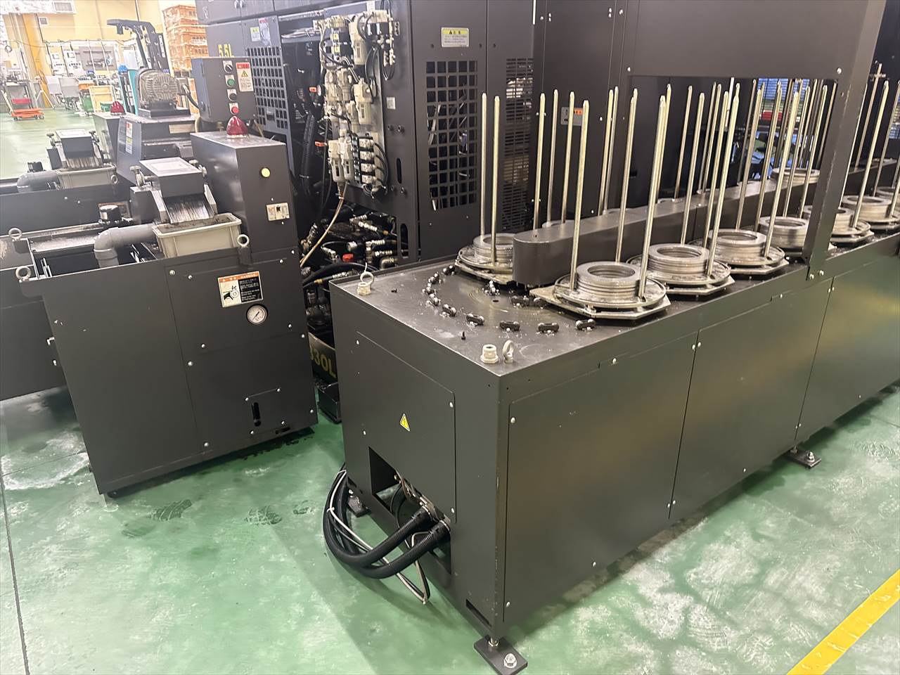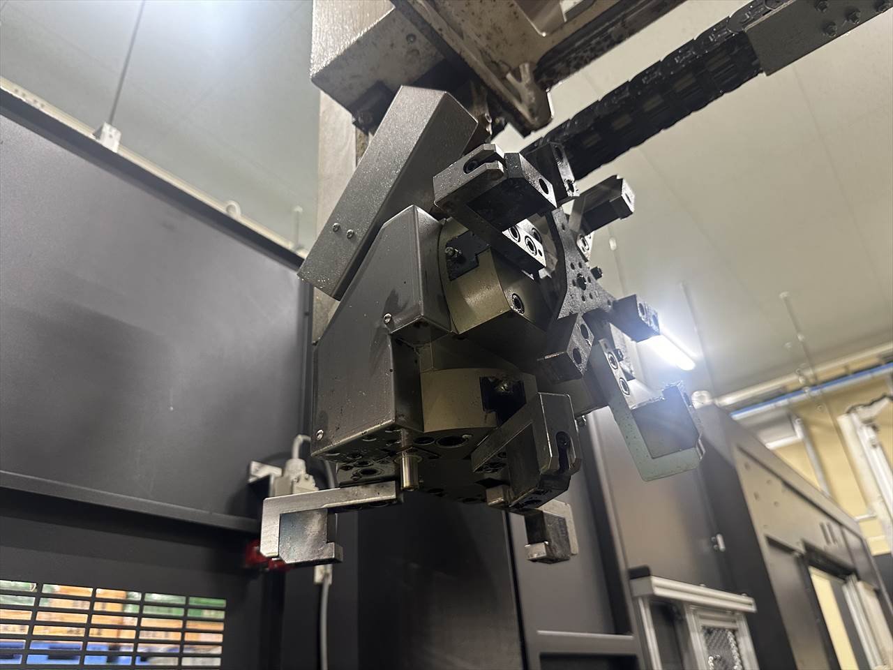 ○特徴  NC装置:OSP P300LA チャック:帝国製コレット 回転シリンダ:北川製F0933  左ストッカ→仮置きNGシュータ→本体→機外計測→NGシュータ→右ストッカ  ○能力・容量  主軸間距離:450mm 標準チャック:8インチ(※現在は特殊チャック)  最大加工径φ250×長さ60mm(本機能力φ350×200mm) 制御軸数:4軸 ○移動量  X軸:200mm Z軸:200mm 早送り速度:X・Z軸24m/min(スベリガイド) ○主軸  回転速度:32~3200rpm(無段) 主軸端:JIS A2-6  軸受内径:φ100mm 貫通穴:φ62mm ○刃物台  形式:V12 工具取付本数:12本 外径バイト:□25mm 内径工具:φ40mm ○モータ  主軸用:18.5/15(30分/連続)×2 送り軸用:(X軸)BL3kw×2(Z軸)BL2.9kw×2 ○ローダ(反転装置付)  ワーク可搬サイズ:φ250×L60mm φ200×85mm 可搬質量:8㎏×2  駆動方式:3軸サーボ(X・Y・Z)  動作範囲:X軸4230mm(ビーム両側出しの場合) Y軸:645mm Z軸:290mm  早送り速度:X軸120 Y軸100 Z軸40m/min  ローダハンド(エアープッシャー付):3爪チャック 爪ストロークφ32mm  反転ハンド:3爪チャック 爪ストロークφ32mm ○ワークテーブル  ワークサイズ:φ40~φ250mm パレット数:16  段積み高さ:450mm ワーク積載質量:50㎏/パレット ○機械の大きさ(ローダ・ストッカー・計測装置・コンベア・高圧クーラントを含む)  幅5430×奥行4000×高さ3093mm(ローダー最大高さ) 重量:8000㎏