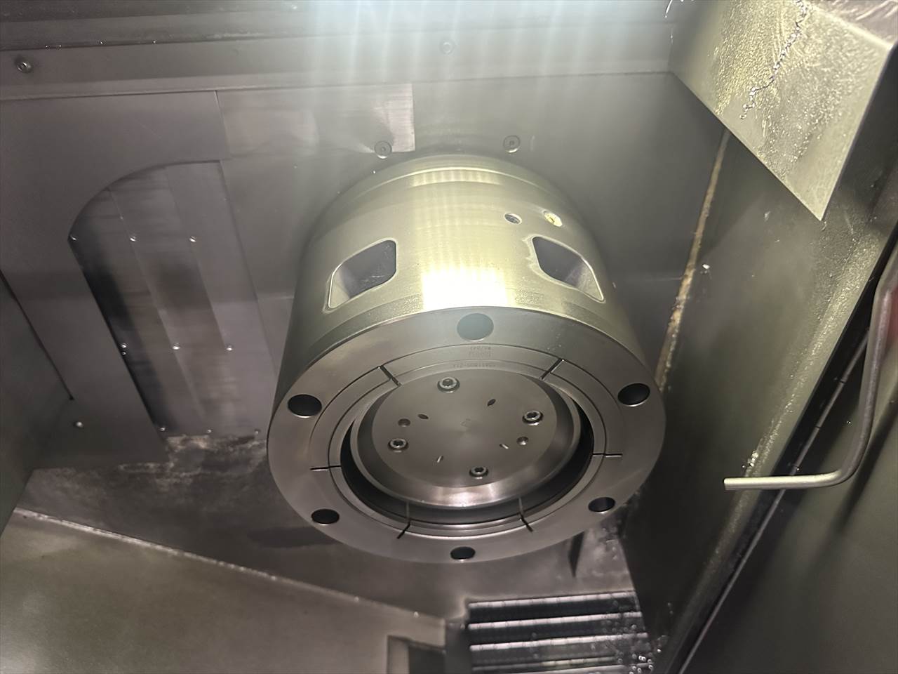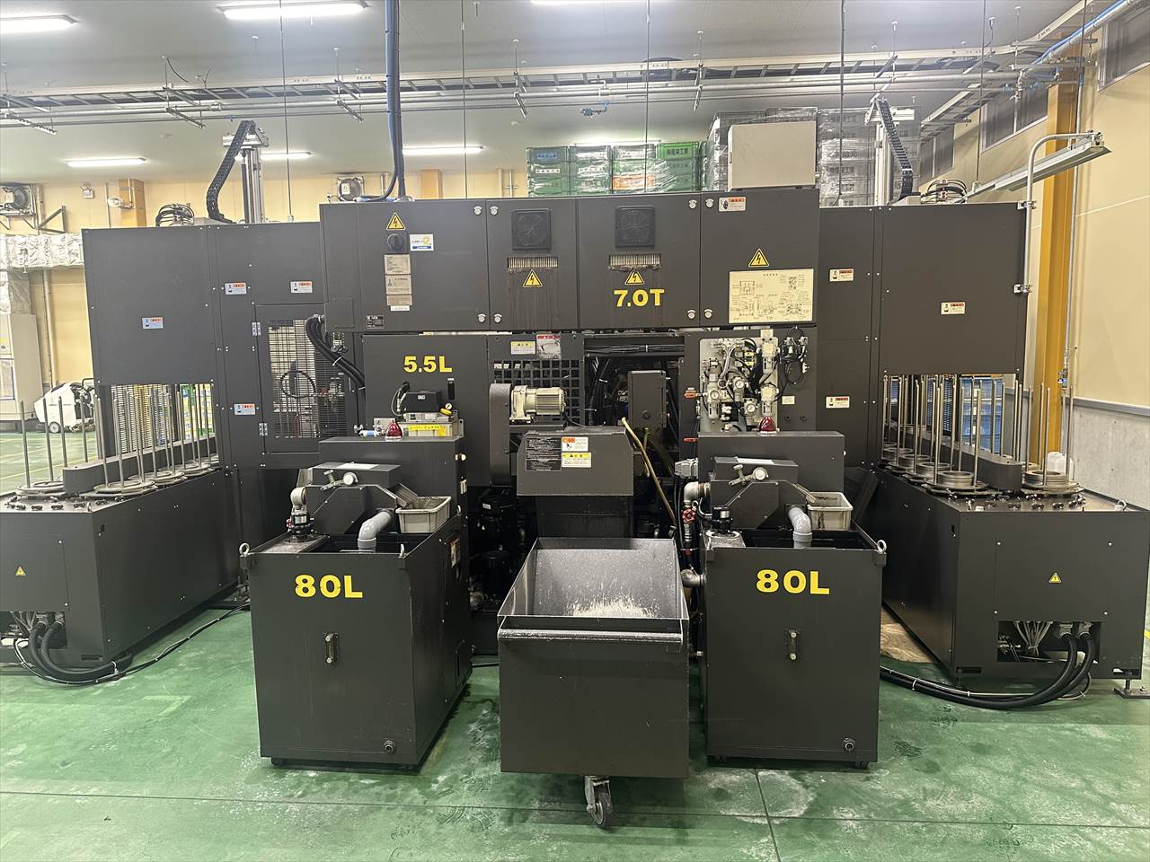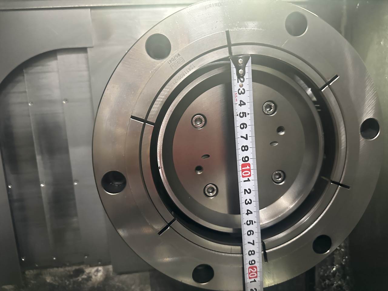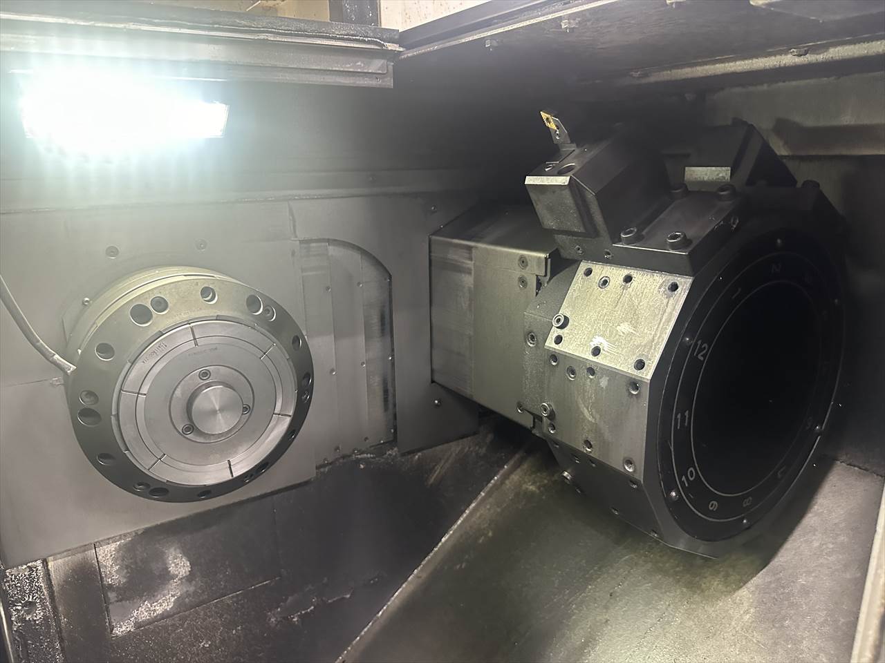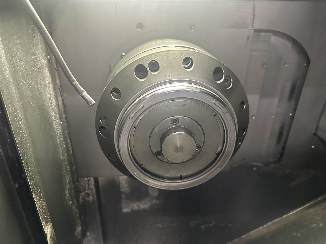 ○特徴  NC装置:OSP P300LA チャック:帝国製コレット 回転シリンダ:北川製F0933  左ストッカ→仮置きNGシュータ→本体→機外計測→NGシュータ→右ストッカ  ○能力・容量  主軸間距離:450mm 標準チャック:8インチ(※現在は特殊チャック)  最大加工径φ250×長さ60mm(本機能力φ350×200mm) 制御軸数:4軸 ○移動量  X軸:200mm Z軸:200mm 早送り速度:X・Z軸24m/min(スベリガイド) ○主軸  回転速度:32~3200rpm(無段) 主軸端:JIS A2-6  軸受内径:φ100mm 貫通穴:φ62mm ○刃物台  形式:V12 工具取付本数:12本 外径バイト:□25mm 内径工具:φ40mm ○モータ  主軸用:18.5/15(30分/連続)×2 送り軸用:(X軸)BL3kw×2(Z軸)BL2.9kw×2 ○ローダ(反転装置付)  ワーク可搬サイズ:φ250×L60mm φ200×85mm 可搬質量:8㎏×2  駆動方式:3軸サーボ(X・Y・Z)  動作範囲:X軸4230mm(ビーム両側出しの場合) Y軸:645mm Z軸:290mm  早送り速度:X軸120 Y軸100 Z軸40m/min  ローダハンド(エアープッシャー付):3爪チャック 爪ストロークφ32mm  反転ハンド:3爪チャック 爪ストロークφ32mm ○ワークテーブル  ワークサイズ:φ40~φ250mm パレット数:16  段積み高さ:450mm ワーク積載質量:50㎏/パレット ○機械の大きさ(ローダ・ストッカー・計測装置・コンベア・高圧クーラントを含む)  幅5430×奥行4000×高さ3093mm(ローダー最大高さ) 重量:8000㎏