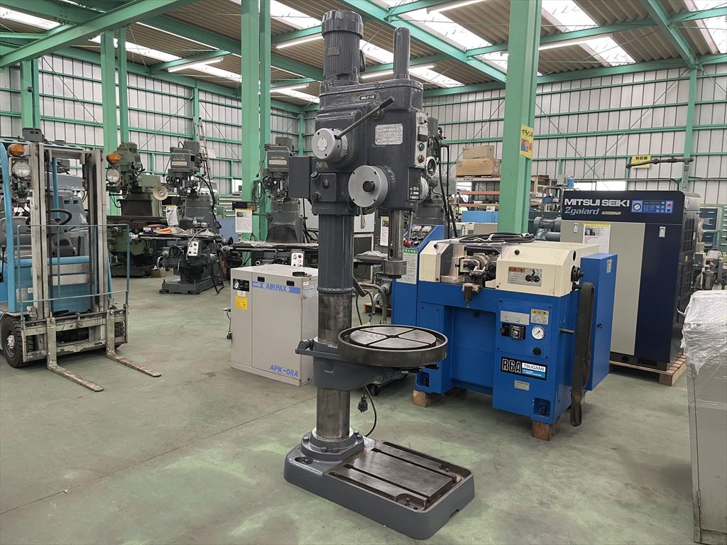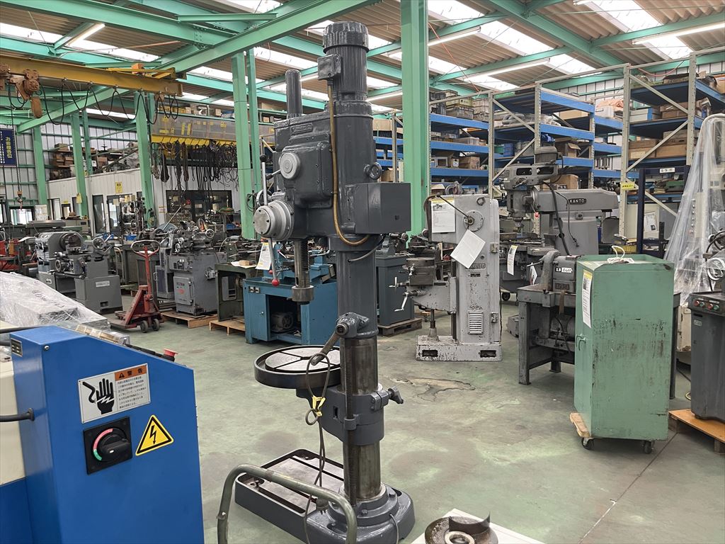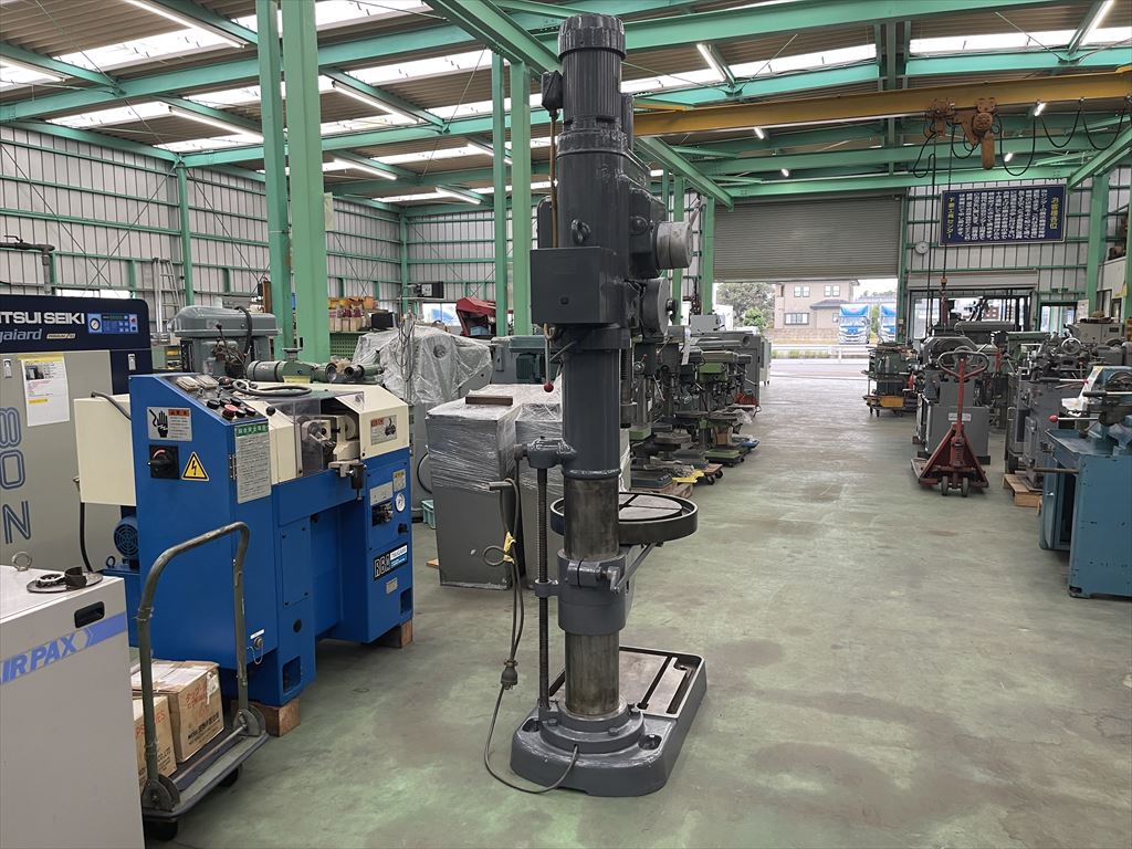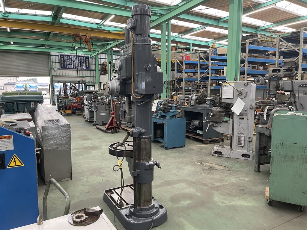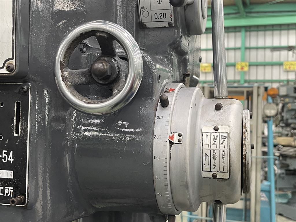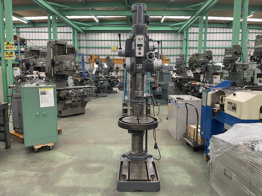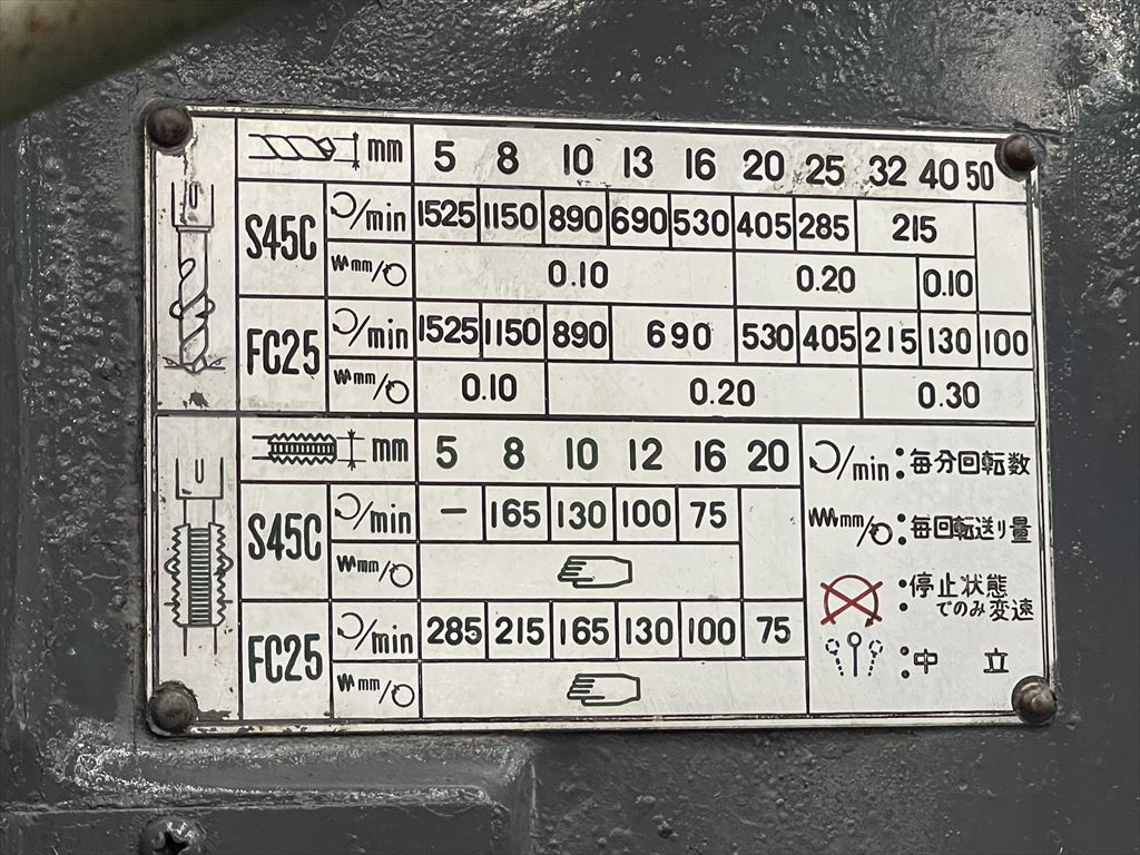 ○加工能力  穴明け能力:鋼φ40 鋳鉄φ50  ネジ立て能力:鋼M16 鋳鉄M20 ○振り能力  振りφ540mm  主軸端とテーブル上面までの距離30mm~755mm  主軸端とベース上面までの距離915mm~1135mm ○主軸  主軸の上下移動距離:自動180mm 手動220mm  主軸穴 のテーパ MT.No,4  主軸速度範囲75~1525rpm(12段)  自動送り量(3段)0.1-0.2-0.3mm/rev ○テーブル  テーブルの大きさφ510mm  テーブルの上下移動距離500mm ○モータ  主軸用1.5kw4P ○機械寸法・重量  ベースの大きさ500mm×900mm 機械の総高さ2200mm 機械重量620㎏