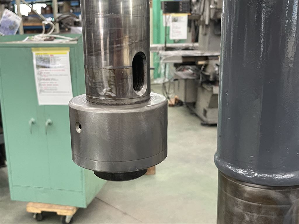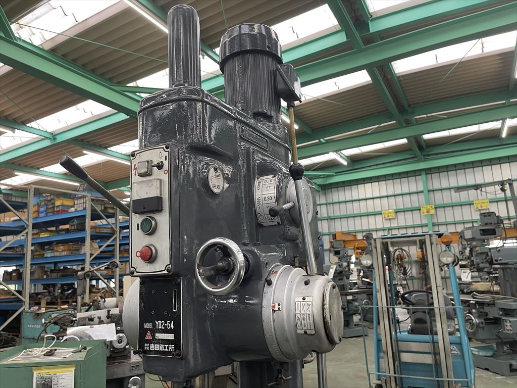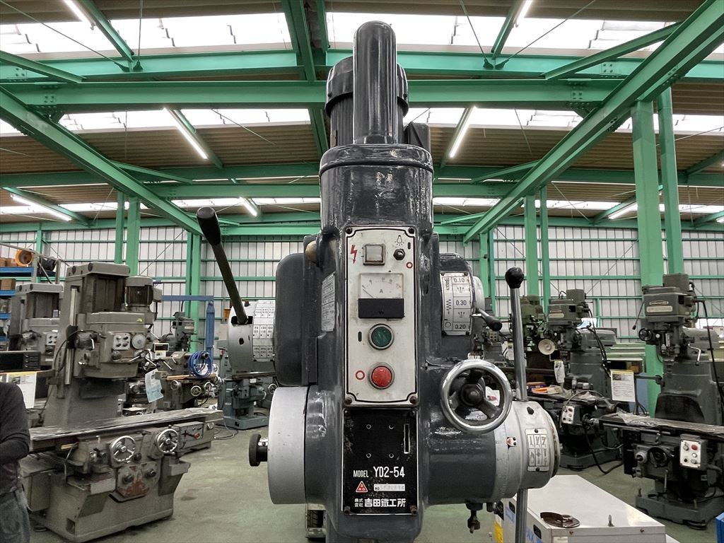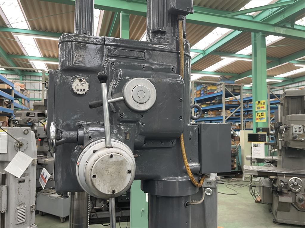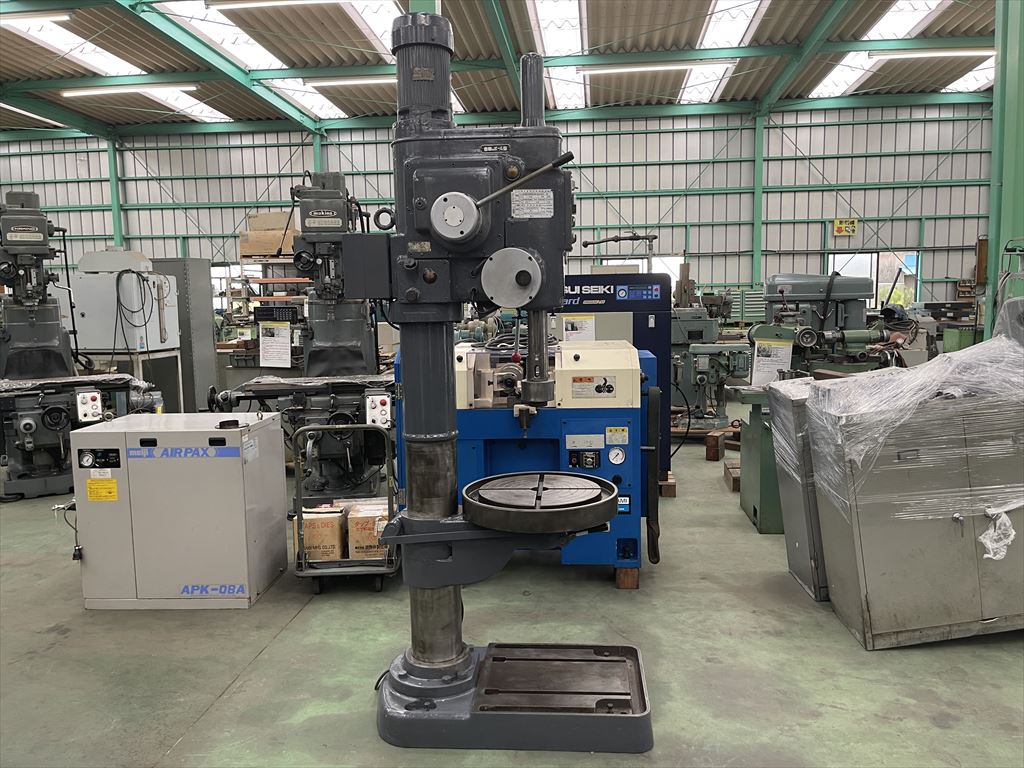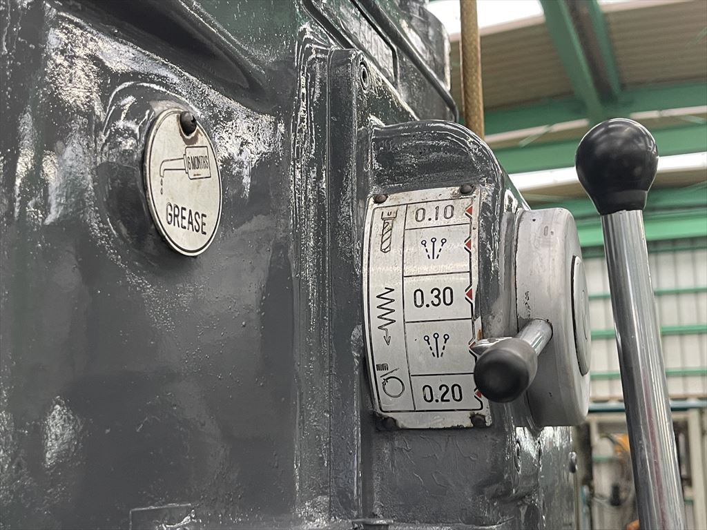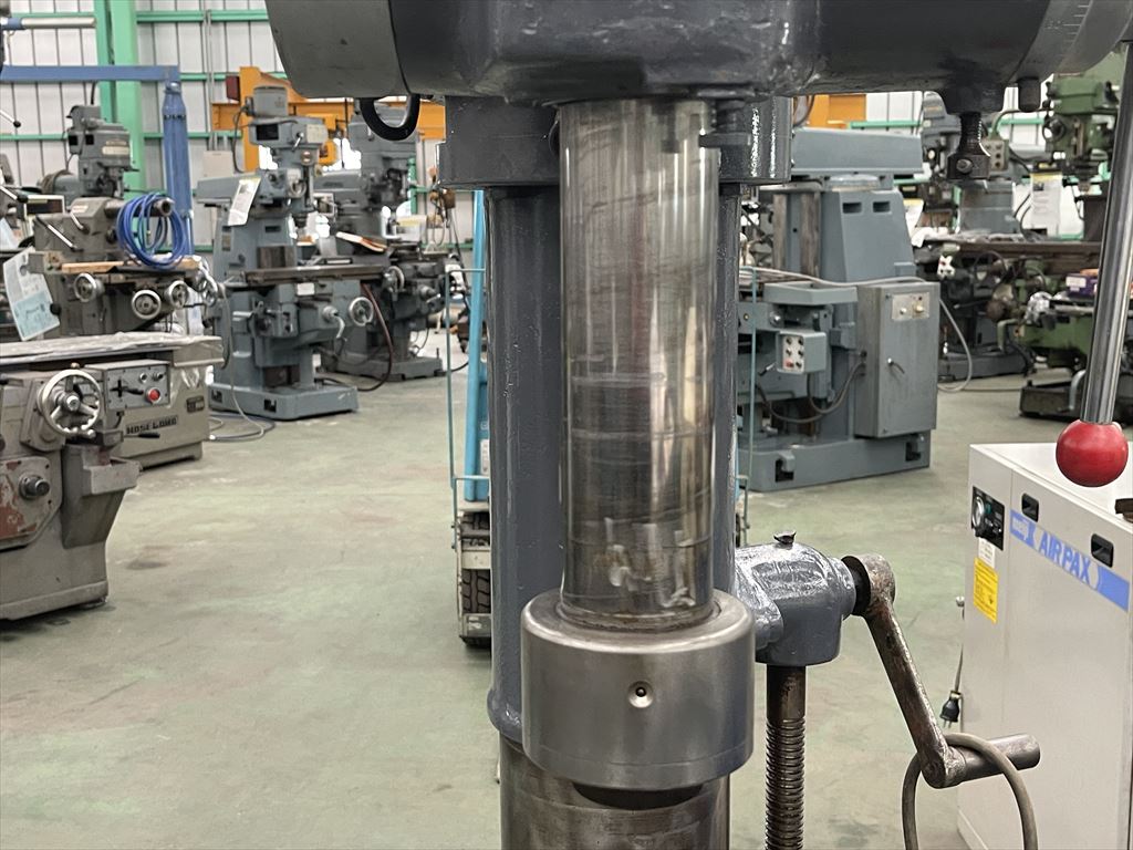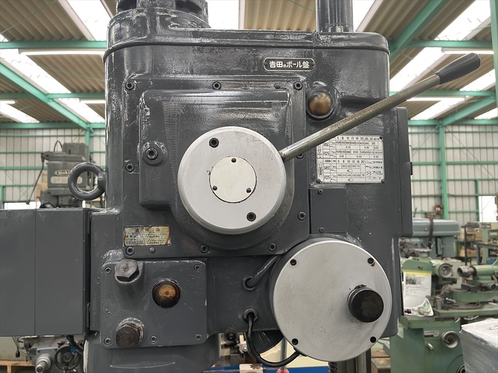 ○加工能力  穴明け能力:鋼φ40 鋳鉄φ50  ネジ立て能力:鋼M16 鋳鉄M20 ○振り能力  振りφ540mm  主軸端とテーブル上面までの距離30mm~755mm  主軸端とベース上面までの距離915mm~1135mm ○主軸  主軸の上下移動距離:自動180mm 手動220mm  主軸穴 のテーパ MT.No,4  主軸速度範囲75~1525rpm(12段)  自動送り量(3段)0.1-0.2-0.3mm/rev ○テーブル  テーブルの大きさφ510mm  テーブルの上下移動距離500mm ○モータ  主軸用1.5kw4P ○機械寸法・重量  ベースの大きさ500mm×900mm 機械の総高さ2200mm 機械重量620㎏