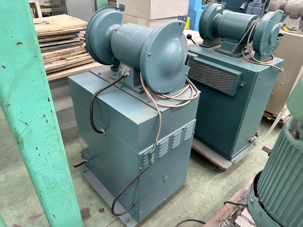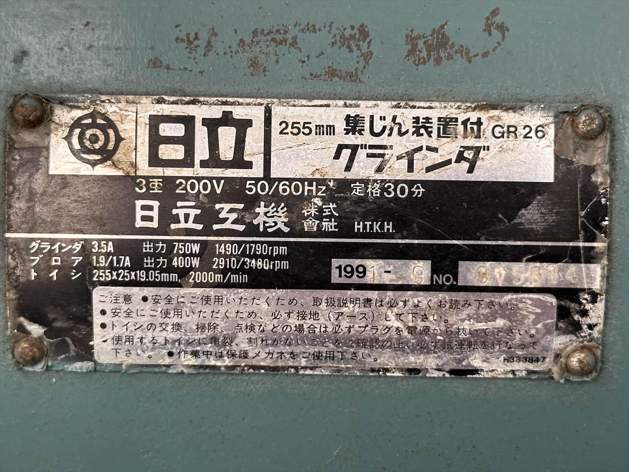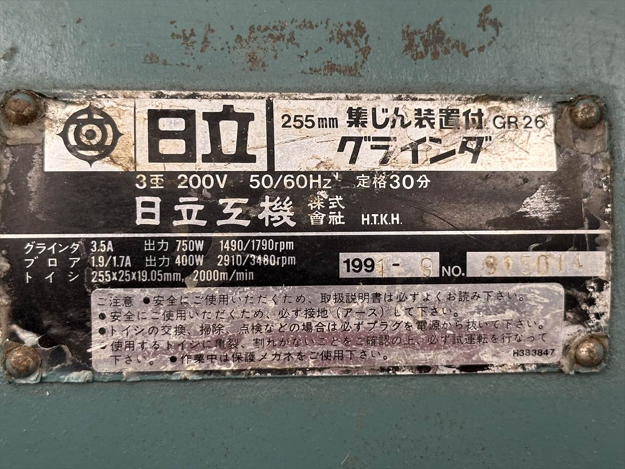○タイプ   集塵装置付両頭グラインダー ○グラインダ   3.5A  出力750W 1490/1790rpm ○ブロア   1.8/1.7A 出力400W 2910/3480rpm ○砥石   寸法φ255×25×φ09.05   研削速度 2000m/min