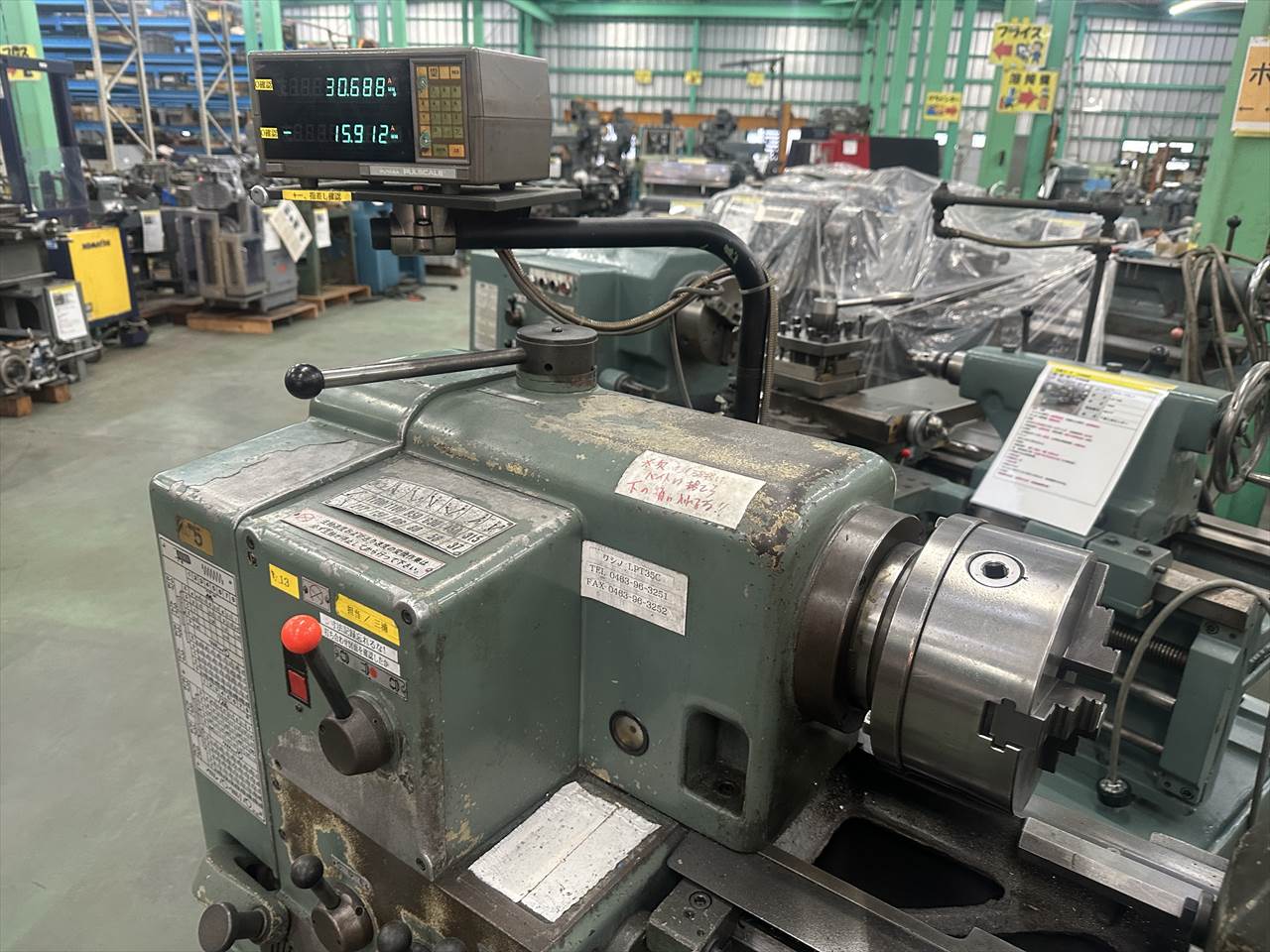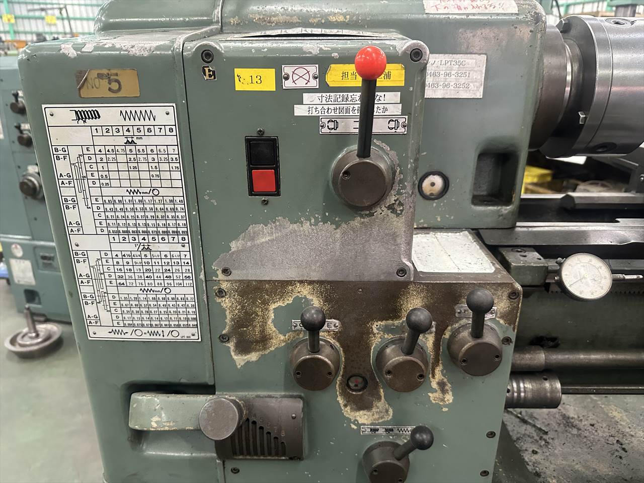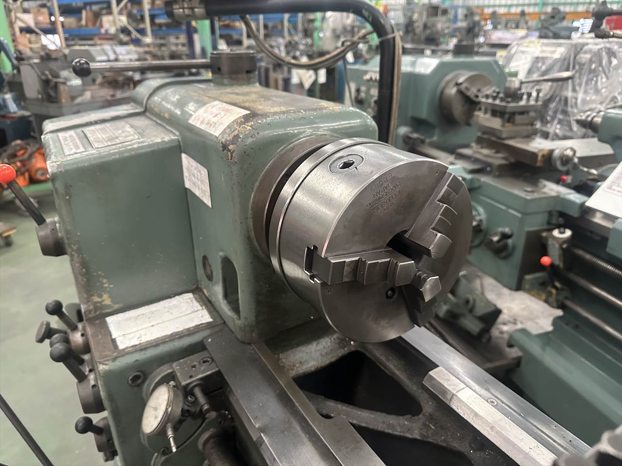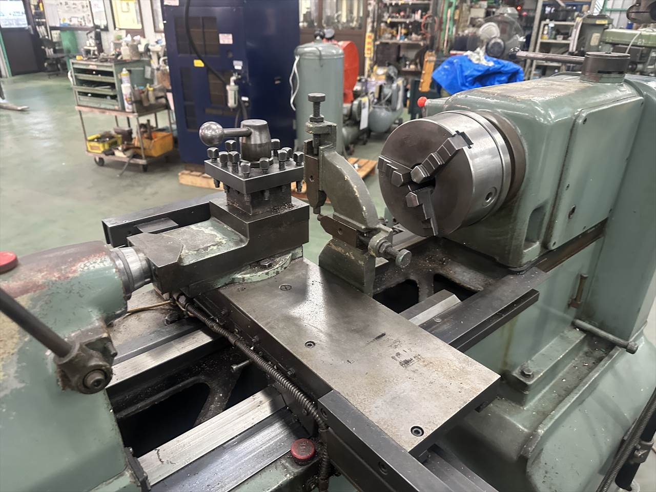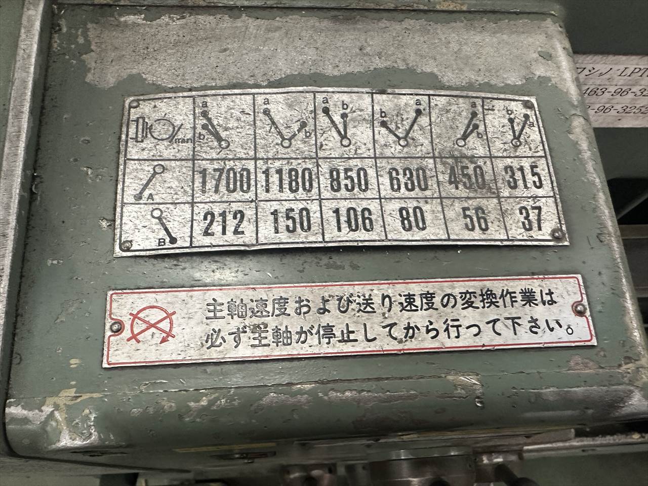 ○特徴  高速精密旋盤(56~2500rpm)  2軸デジタル(往復台左右と手送り刃物台) 移動振れ止め ○能力・容量  ベッド上の振り:φ360mm 往復台上の振り:φ180mm  センター間距離:500mm ○主軸  チャック直径:φ190mm 回転速度:56~2500rpm(12段変速)  主軸貫通穴:φ32mm 主軸端形状 A1-5 ○心押台  テーパ MT№4  心押軸の移動量:120mm ○ベッド  長さ1350×幅280mm ○往復台  往復台の移動量:480mm 横送り台の移動量:245mm  刃物送り台の移動量:100mm  送り変換数:40種 横送りハンドル目盛:0.025mm/1目  刃物台送りハンドル目盛り:0.02mm/1目 ○ねじ切  メートルねじ:0.25~7mm インチねじ:112~4山/インチ  親ねじ直径:φ28×P=4 ○モータ  3.7kw4P ○機械の大きさ  幅1700×奥行1080×高さ1190 重量1200㎏
